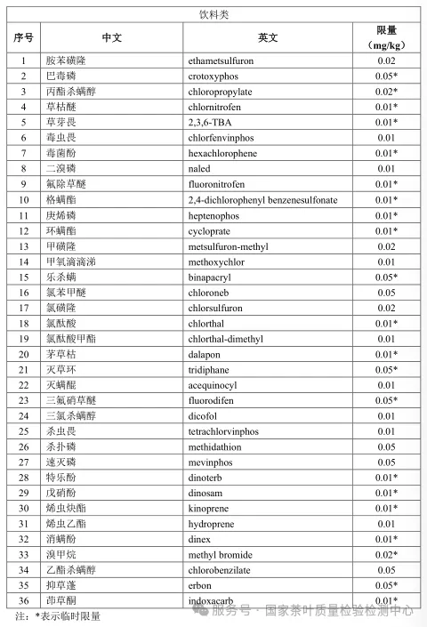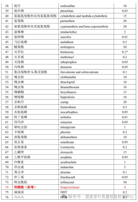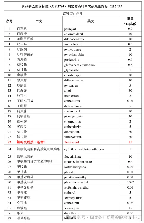 Currently, GB 2763-2026 stipulates that the maximum residue limit for Flonicamid in tea is 15 mg/kg (residue defined as Flonicamid), and the maximum residue limit for Fenpyroximate is 8 mg/kg (residue defined as Fenpyroximate).