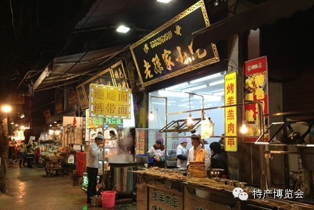 一走进吉庆街,在不足30米的街道上,三四十顶鲜红的帐篷错落有致地连成一片。在这里,各种菜食一律摆在敞开排列的货架上,一目了然,由顾客随意选择、自由搭配。更为独特的是在这个大排档常年活跃着一支能弹会拉善唱的民间艺人队伍,他们怀揣曲谱、手持乐器随时应招着你的呼唤。