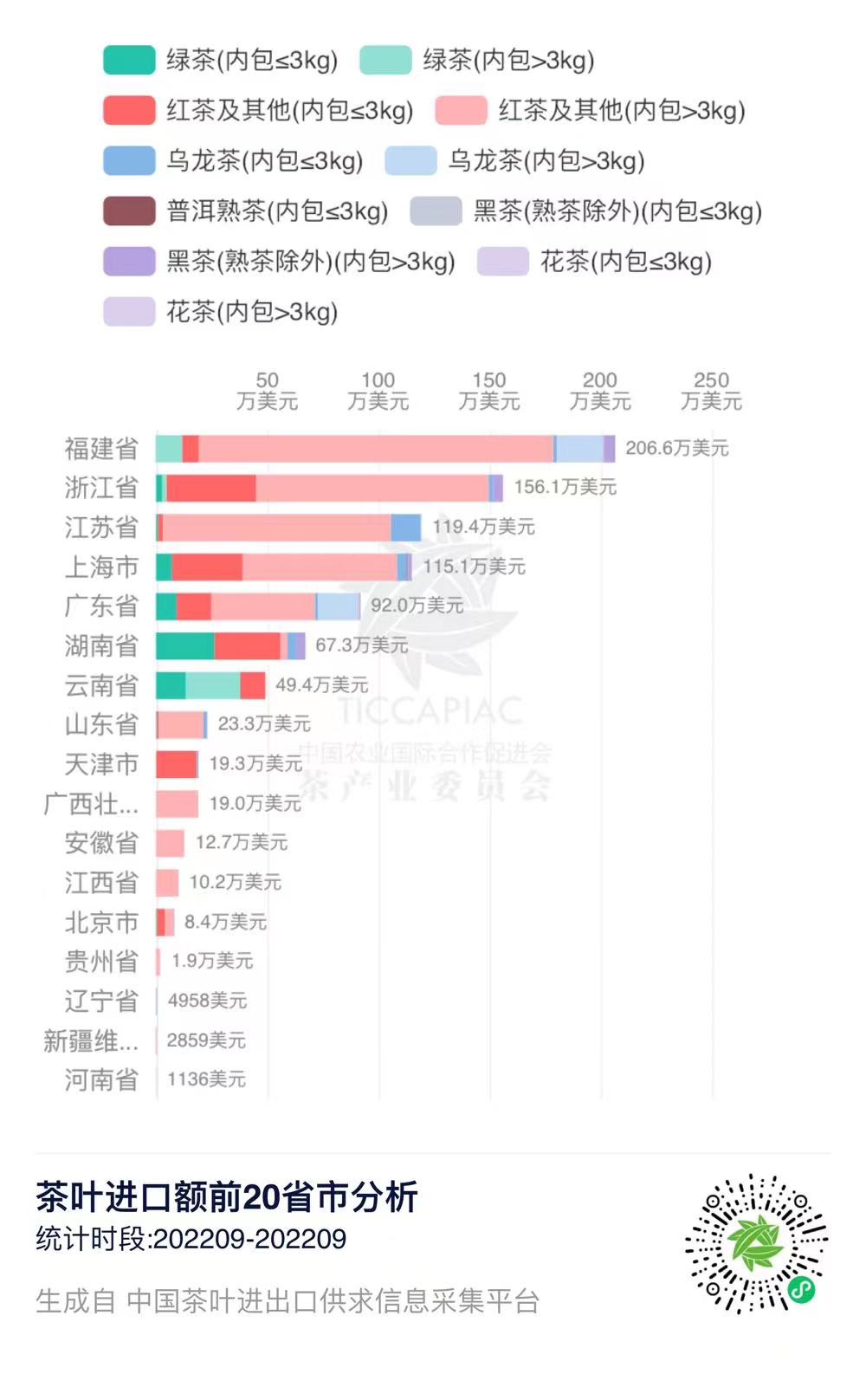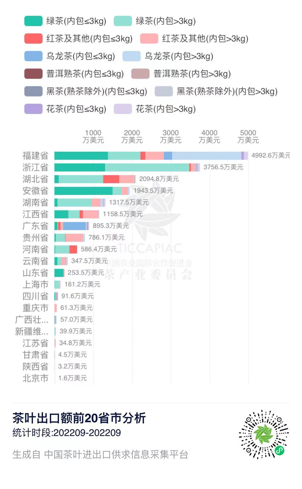 2022年9月中国茶叶出口额前20省市
