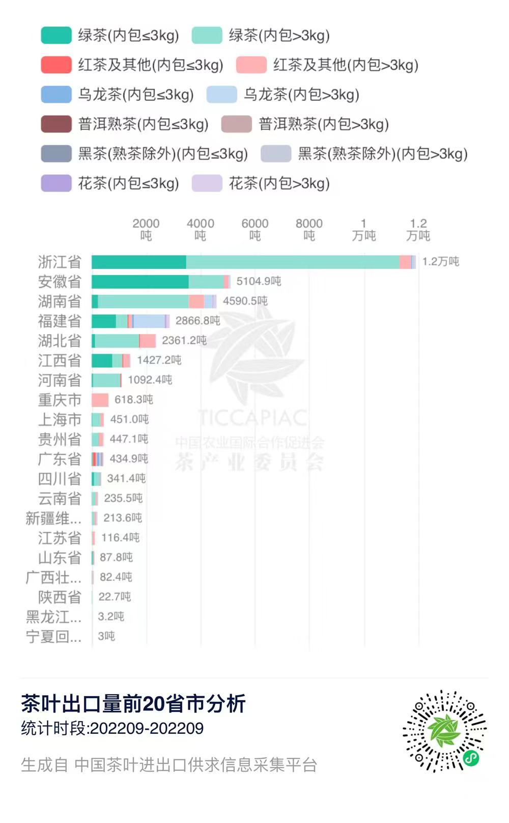 2022年9月中国茶叶出口量前20省市
