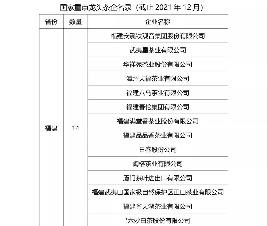 2021年12月30月,农业农村部与国家发展改革委、商务部、中国人民银行、国家税务总局、中国证券监督管理委员会、中华全国供销合作总社7部委正式发布了《关于公布第七批农业产业化国家重点龙头企业名单的通知》,认定412家企业为农业产业化国家重点龙头企业,其中,福建安溪铁观音集团股份有限公司、武夷星茶业有限公司、华祥苑茶业股份有限公司等18家茶行业企业入选。至此,农业产业化国家重点龙头企业队伍中,茶行业企业的总数量已达86家。