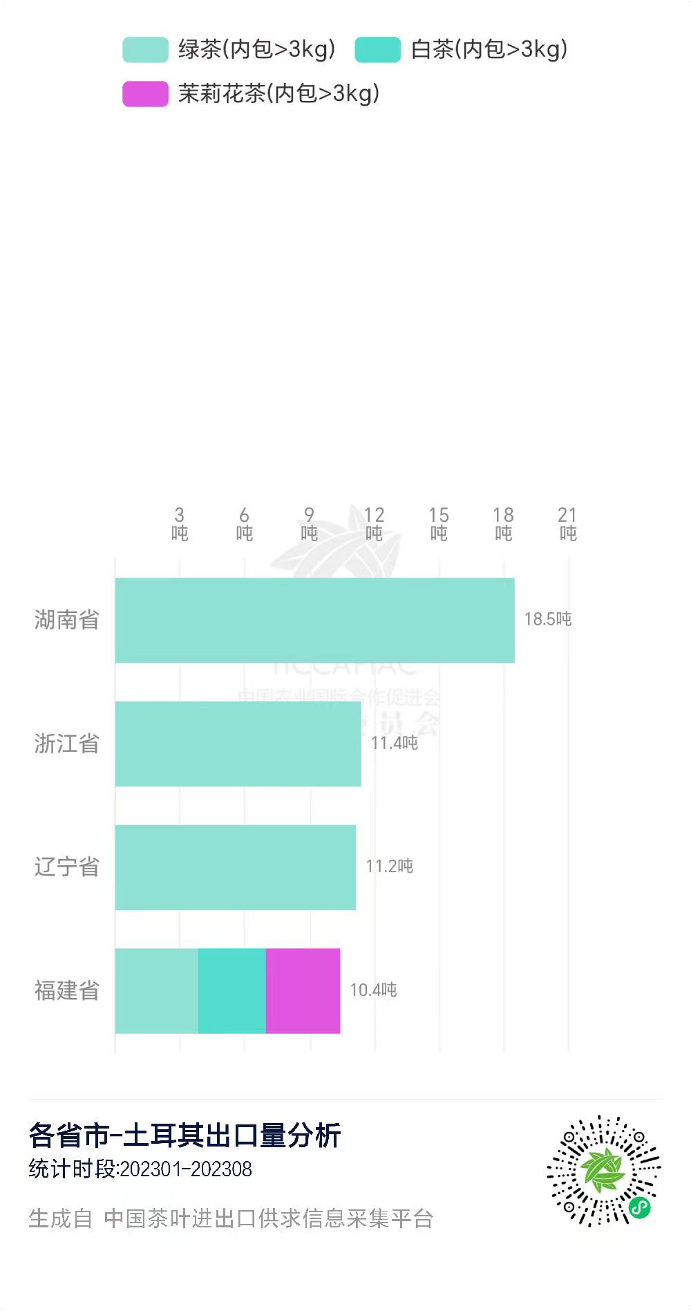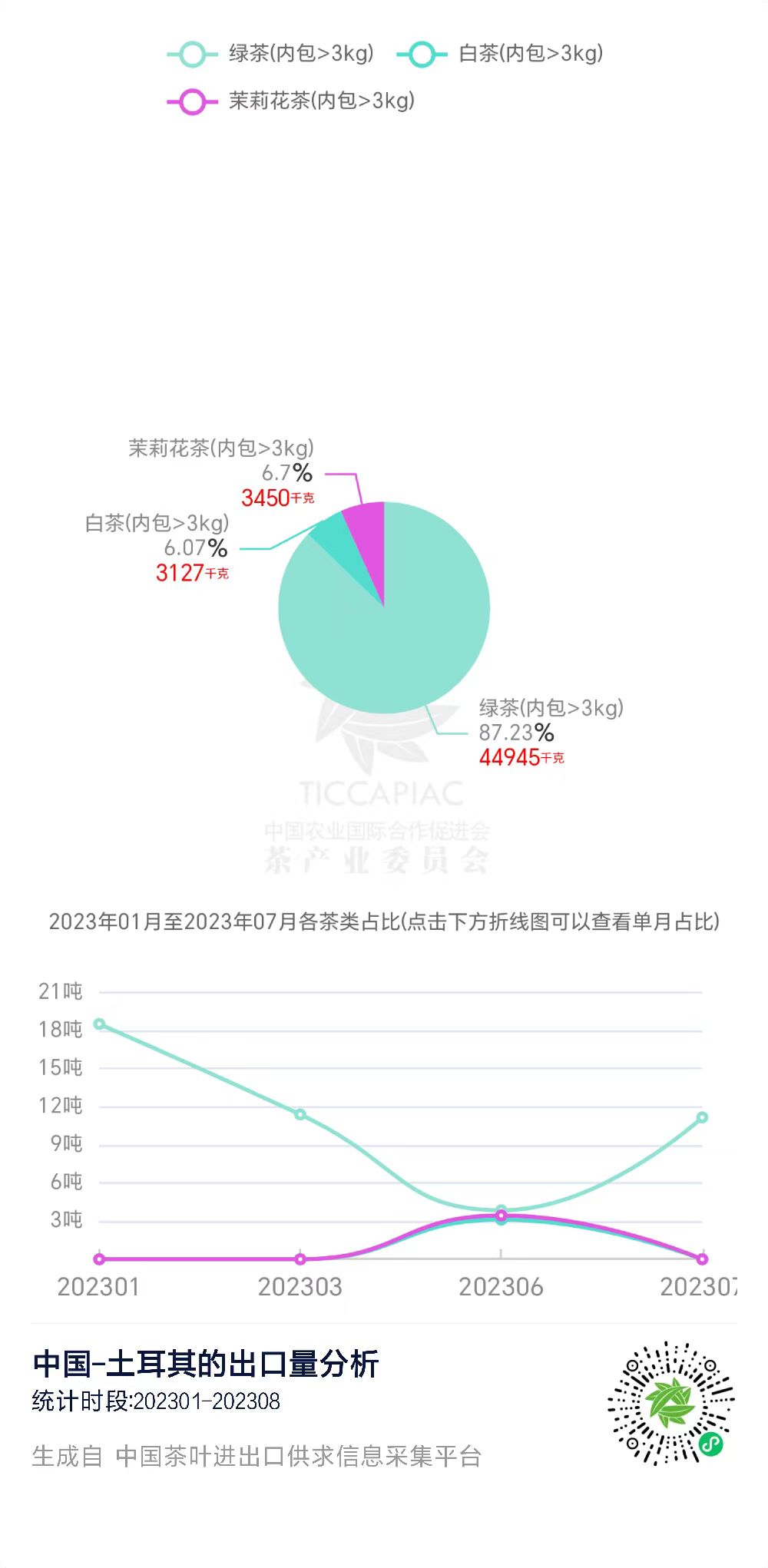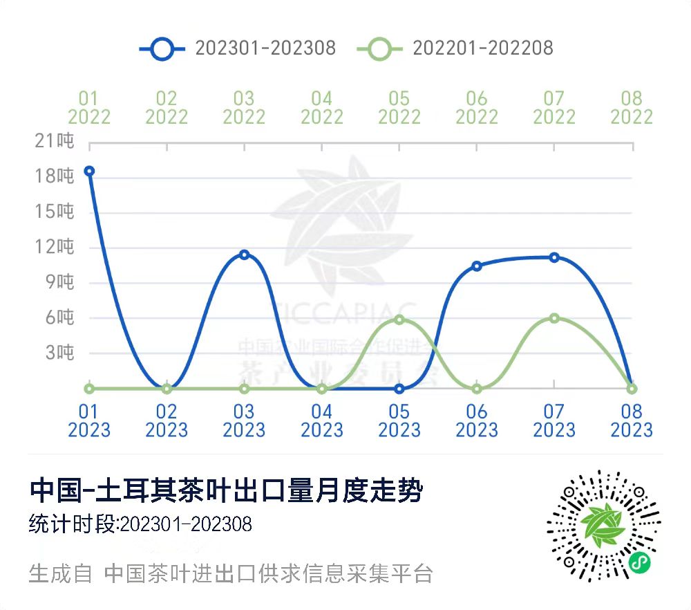在“中国茶叶进出口供求信息采集平台”上,我们可以查询到2023年1-8月中国与土耳其的茶叶进出口贸易数据。