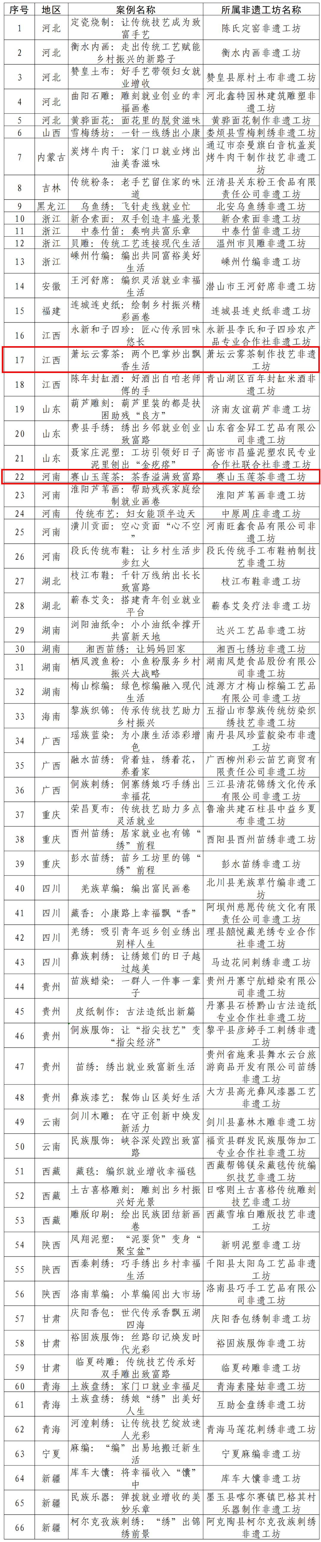 江西萧坛云雾茶制作技艺非遗工坊案例:“萧坛云雾茶:两个巴掌炒出飘香生活”和河南赛山玉莲茶非遗工坊案例:“赛山玉莲茶:茶香溢满致富”路入选两个案例入选。