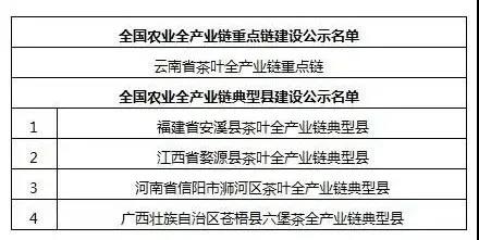 公示名单中显示,云南省茶叶全产业链入选全国农业全产业链重点链建设,福建省安溪县茶叶全产业链、江西省婺源县茶叶全产业链、河南省信阳市浉河区茶叶全产业链、广西壮族自治区苍梧县六堡茶全产业链入选全国农业全产业链典型县建设。(详见下图)。