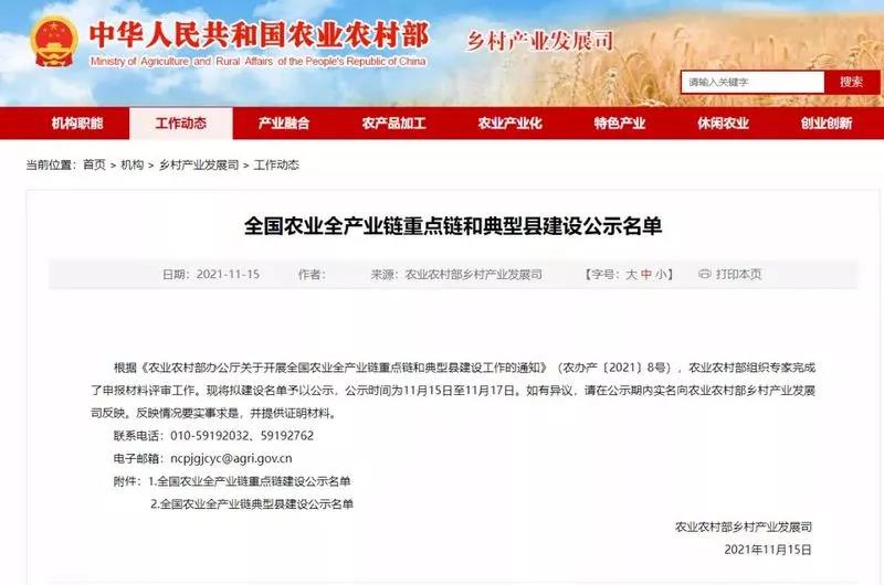 为打造一批创新能力强、产业链条全、绿色底色足、安全可控制、联农带农紧的农业全产业链,11月15日,农业农村部乡村产业发展司公示全国农业全产业链重点链和典型县建设名单,共31条重点链和63个全产业链典型县入选。