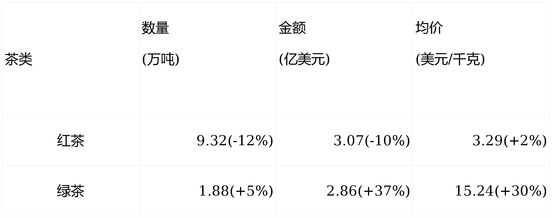 2.小包装享有更高的均价:内包装≤3千克的绿茶,均价高达 20.59 美元/千克(同比增18%) 。反观占比超七成的大包装(>3千克)红茶,均价仅为 2.06 美元/千克,沦为低附加值的原料供给 。