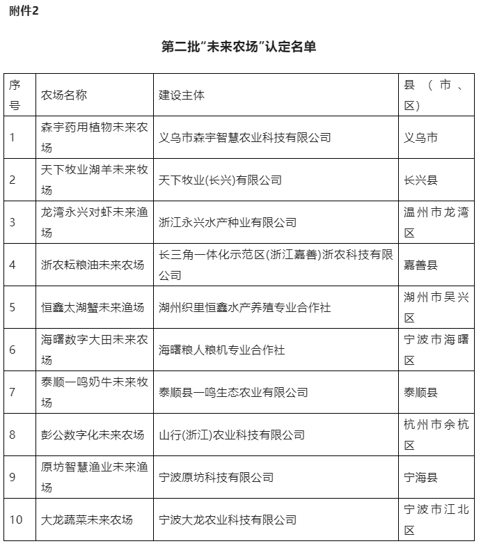 近日,浙江省农业农村厅发布关于2022年数字农业工厂和第二批“未来农场”认定结果的通知。根据浙江省数字化改革、数字乡村建设和农业“双强”行动等部署要求,为加快推进农业产业数字化,推动数字技术装备的系统集成与综合运用,浙江省农业农村厅组织开展了数字农业工厂(含数字农场、数字牧场、数字渔场)和第二批“未来农场”(含未来农场、未来牧场、未来渔场)认定申报工作。经各地自评、省级复核,择优确定数字农业工厂认定名单(附件1),组织开展了第二批“未来农场”路演活动,经专家评审,择优确定第二批“未来农场”认定名单(附件2)。