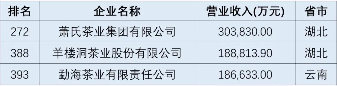 12月15日,农民日报社发布了《2021(第五届)中国农业企业500强榜单》,3家茶企上榜,分别是:萧氏茶业集团有限公司,羊楼洞茶业股份有限公司,勐海茶业有限责任公司。