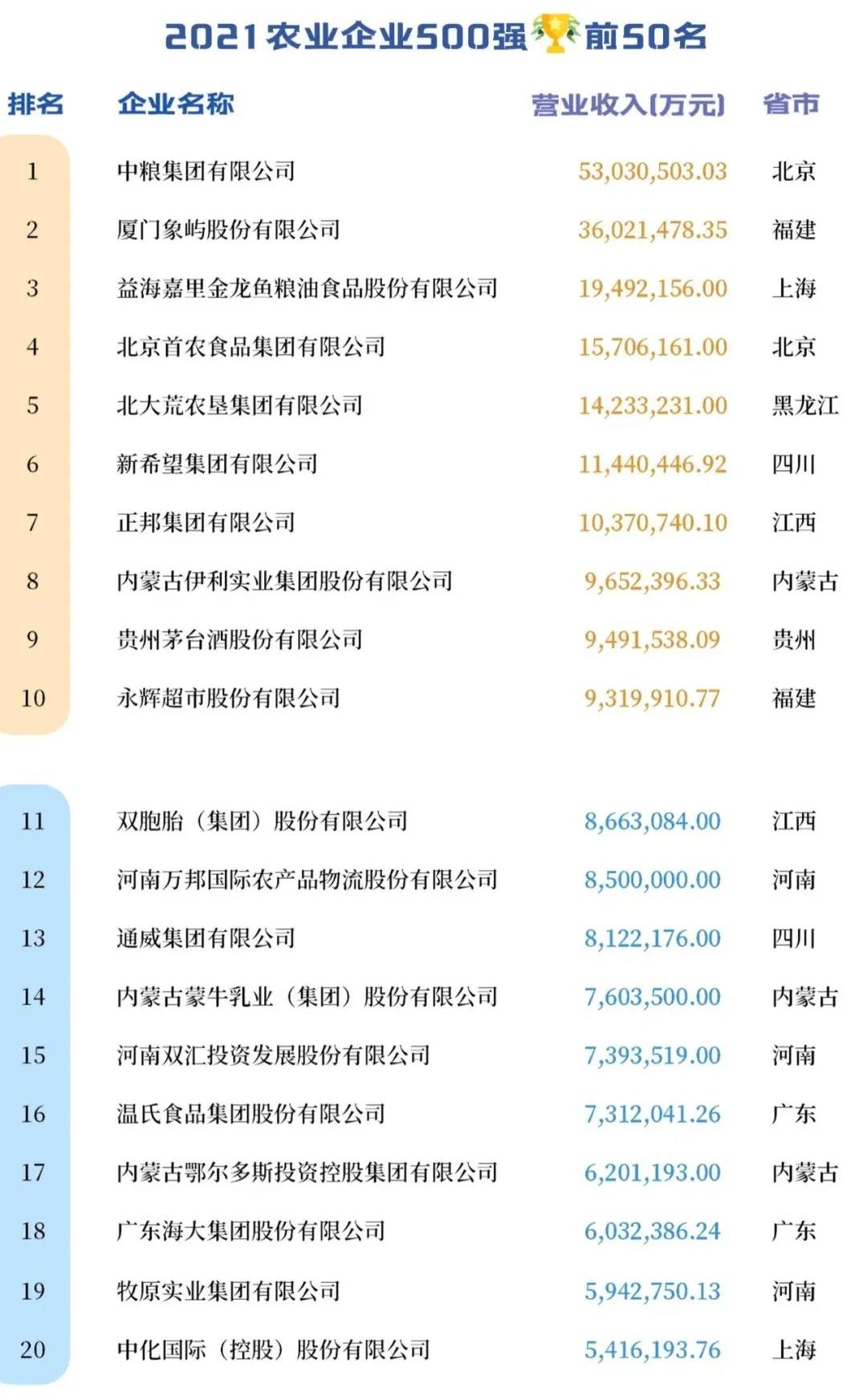 以下为2021农业企业500强前50强(点击左下角“阅读原文”可查看500强名单)。