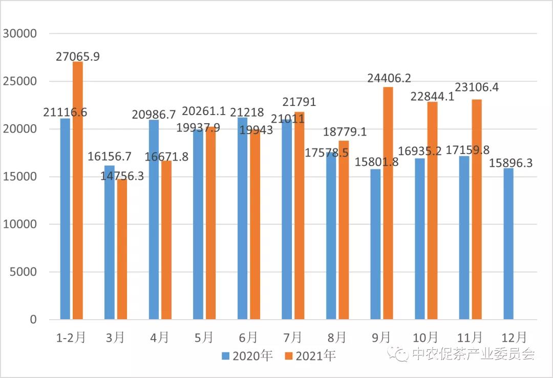 2020-2021年各月中国茶叶出口量比较