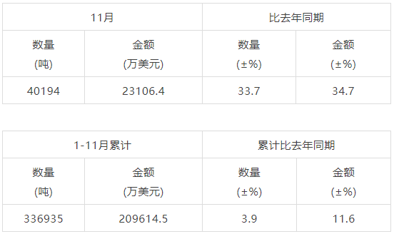 据中国海关数据,2021年11月,中国茶叶出口量为40194吨,出口额为23106.4万美元。2021年1-11月,中国茶叶累计出口量为336935吨,累计出口额为209614.5万美元。