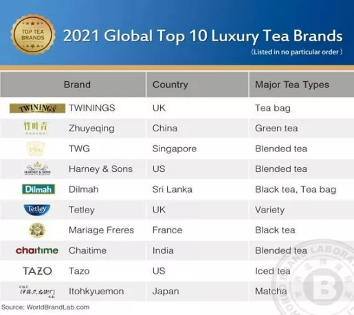 实验室指出,其数据收集和评估过程着眼于来自世界各地不同国家和地区的众多豪华茶品牌。该研究对全球市场5000多个茶叶品牌进行了初步筛选,并选择了茶叶行业的300个“超级品牌”。这些品牌来自20多个茶产业成熟的国家,包括英国、美国、法国、印度、斯里兰卡、中国、日本和新加坡。