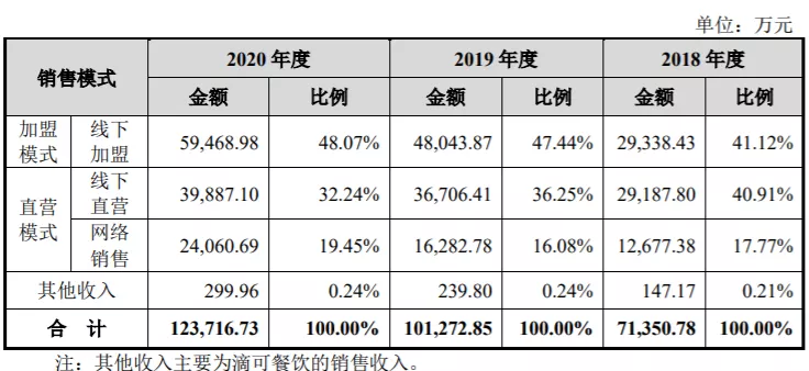 报告期内,八马茶业通过线下加盟模式销售额分别为2.93亿元、4.8亿元及5.95亿元,占主营业务收入比例为41.12%、47.44%及48.07%。