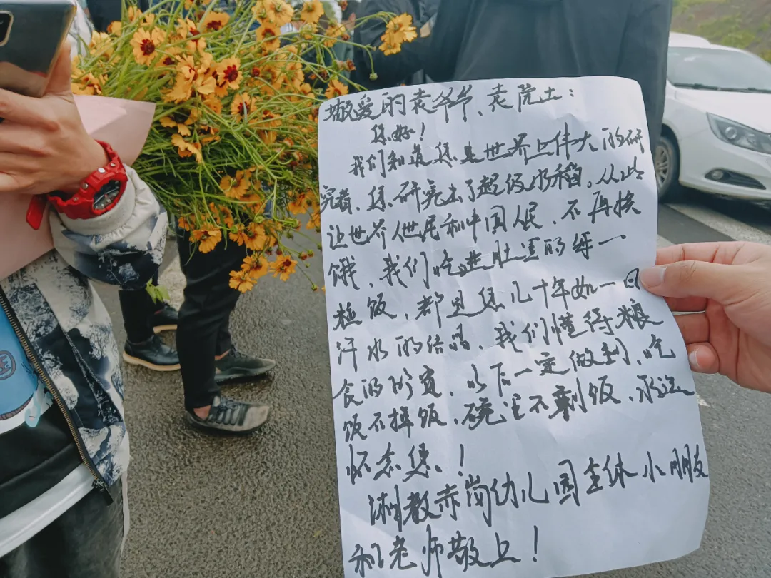 湘教赤岗幼儿园全体小朋友和老师为袁爷爷写了一封信:我们懂得粮食的珍贵,以后一定做到,吃饭不掉饭,碗里不剩饭,永远怀念您!