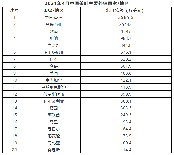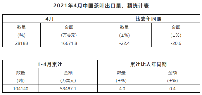 据中国海关数据,2021年4月,中国茶叶出口量为28188吨,出口额为16671.8万美元。2021年1-4月,中国茶叶累计出口量为104140吨,累计出口额为58487.1万美元。