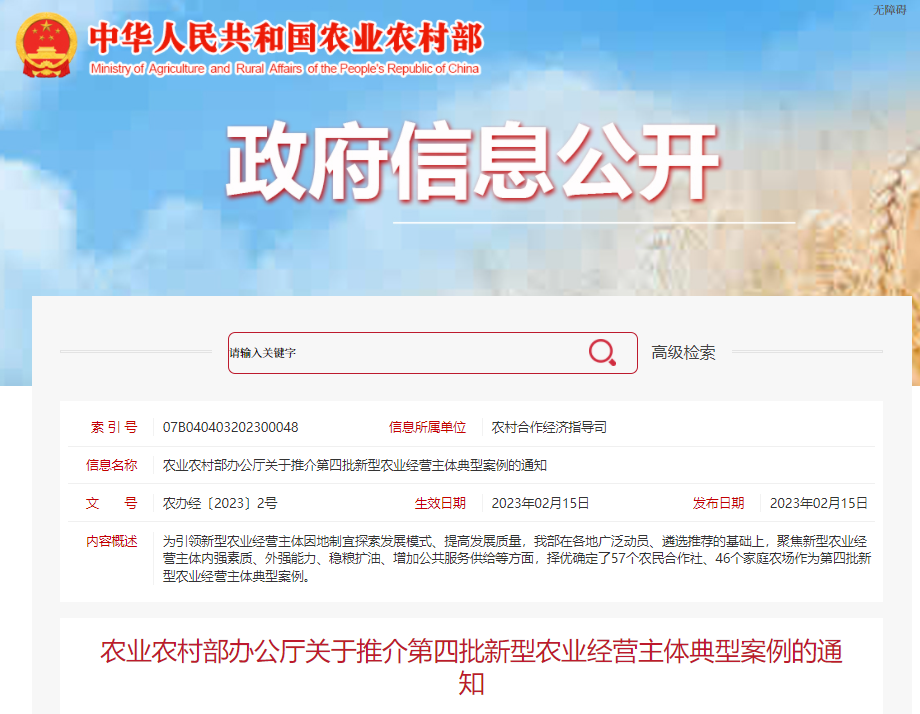 2月15日,农业农村部办公厅发布了关于推介第四批新型农业经营主体典型案例的通知,为引领新型农业经营主体因地制宜探索发展模式、提高发展质量,农业农村部在各地广泛动员、遴选推荐的基础上,聚焦新型农业经营主体内强素质、外强能力、稳粮扩油、增加公共服务供给等方面,择优确定了57个农民合作社、46个家庭农场作为第四批新型农业经营主体典型案例。