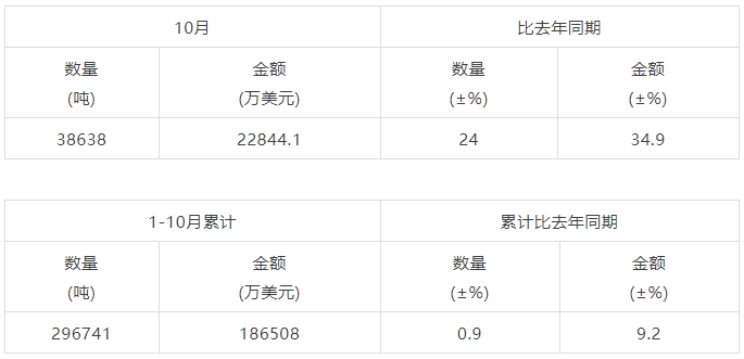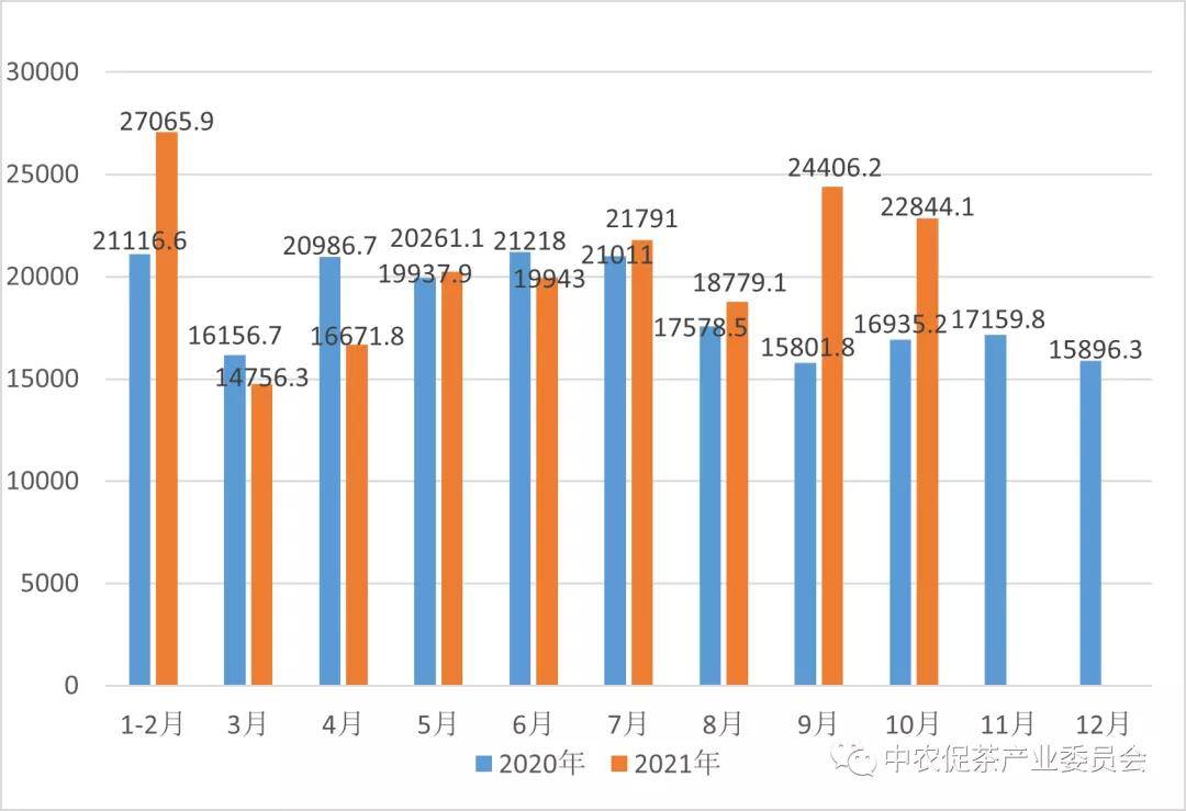 据中国海关数据,2021年10月,中国茶叶进口量为3189.7吨,进口额为1300万美元。1-10月,中国茶叶累计进口量为38920.5吨,累计进口额为15241.3万美元。