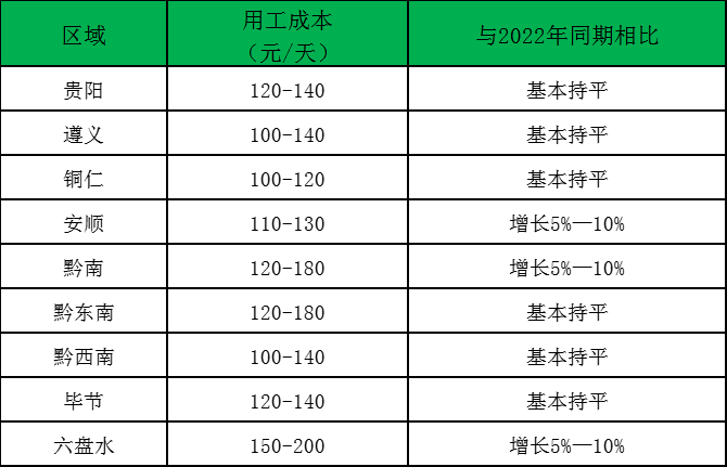 截至2023年3月31日,全省采茶工每天平均工资在120-140元左右,高海拔地区最高超过180元/天,与去年相比增幅在5%—10%之间。(表1)