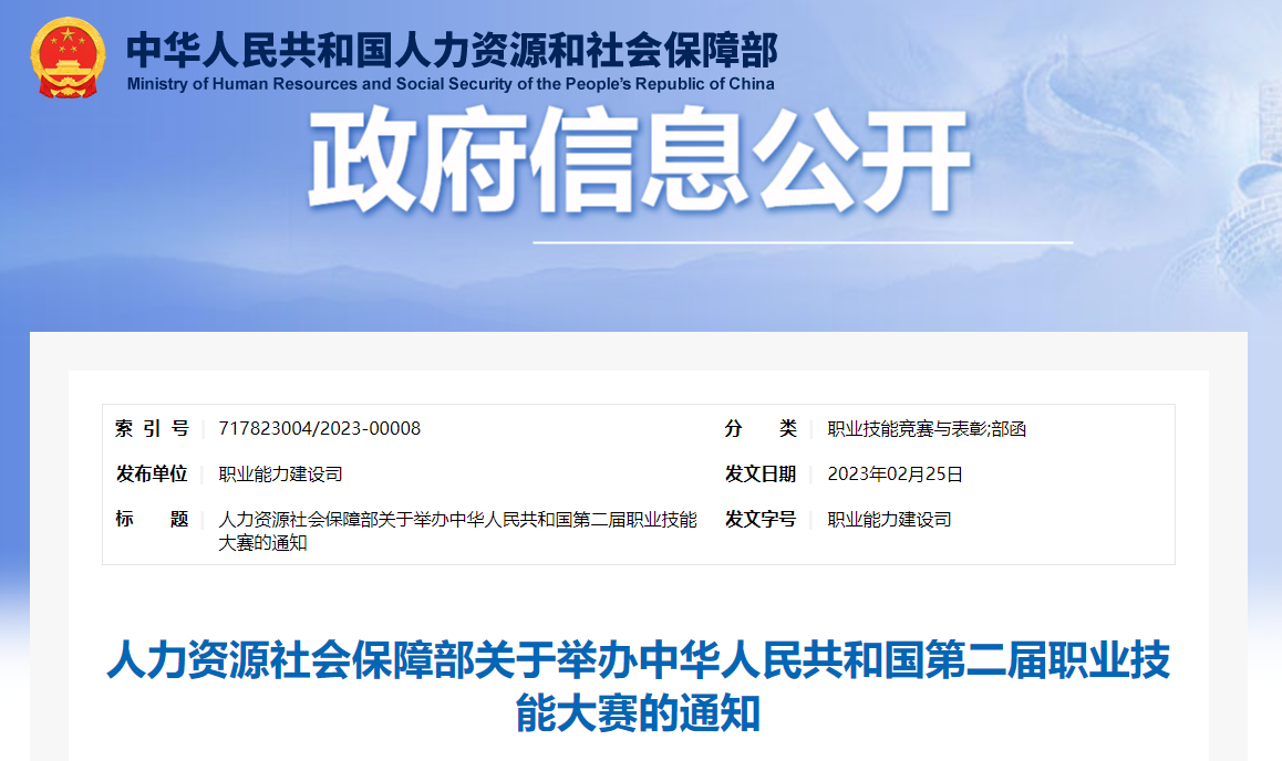 为深入学习贯彻落实党的二十大精神,全面贯彻落实习近平总书记对技能人才工作重要指示和致首届全国技能大赛贺信精神,人社部定于2023年9月在天津举办中华人民共和国第二届职业技能大赛(以下简称第二届全国技能大赛)。现将有关事项通知如下: