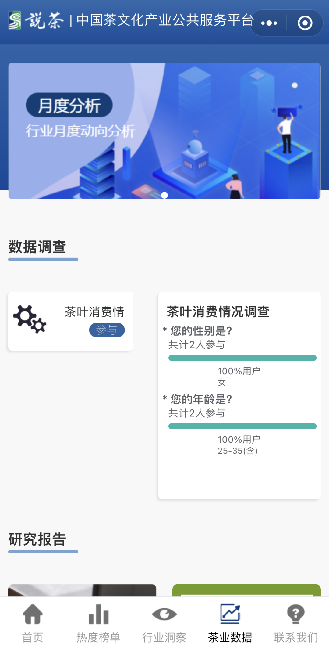 在“说茶”小程序中,茶业数据模块划分为数据调查、研究报告。