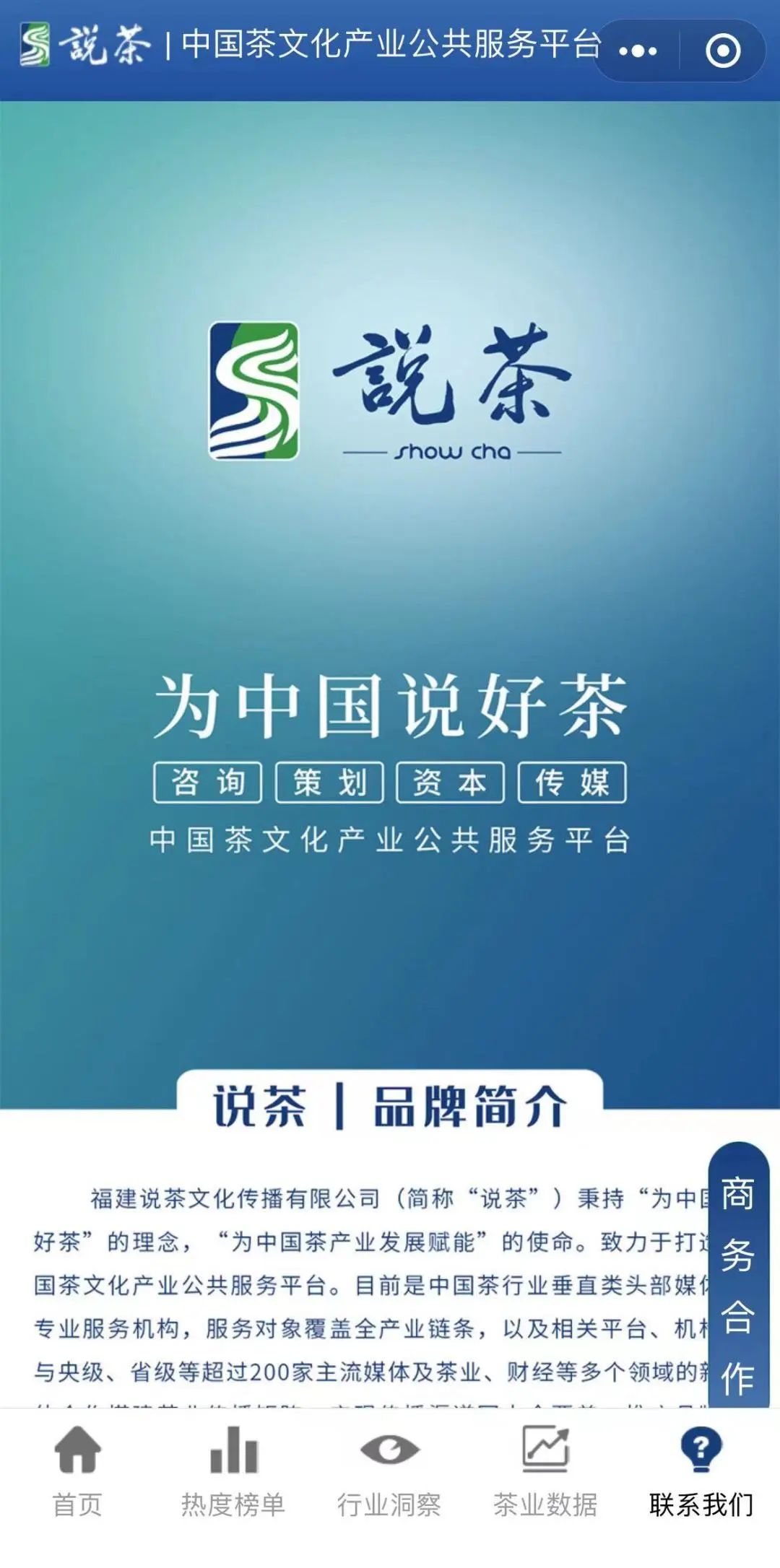 如果您想要了解更多,点击“联系我们”可以看到“说茶”品牌简介、传播矩阵、“说茶”专家智库、《中国茶商业白皮书》介绍、服务案例以及商务合作等内容板块。“说茶”服务过20多个茶产区政府、50多家企业品牌、200多场茶事活动......无论您是想提升茶产区知名度与影响力,还是推广茶品牌,都可以通过“说茶”小程序商务合作板块与“说茶”联系。