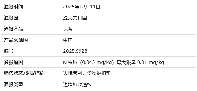 2025年12月11日,欧盟委员会通报了1例我国出口抹茶的不合格案例,主要原因是呋虫胺含量(0.043 mg/kg)超过最大限量 0.01 mg/kg。