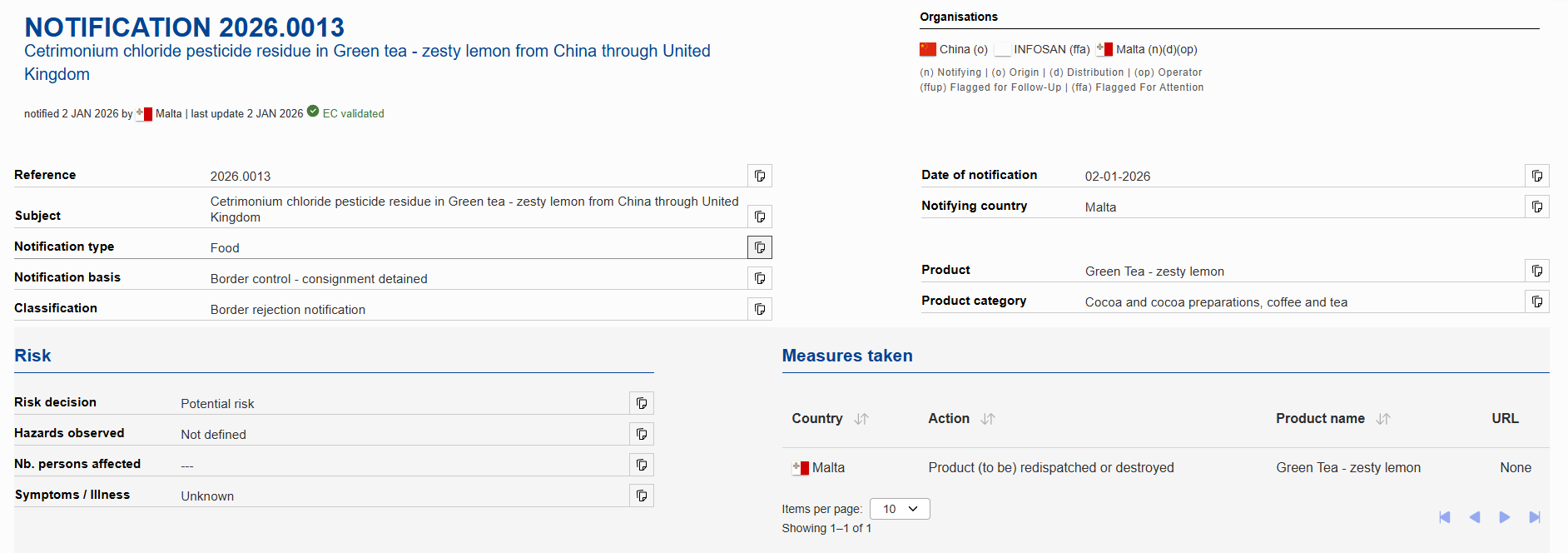 出口预警丨欧盟通报1例我国出口的绿茶因农残超标被马耳他拒收