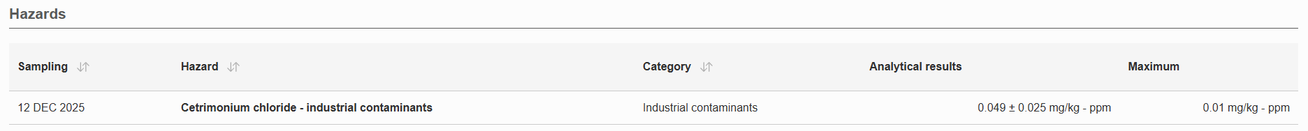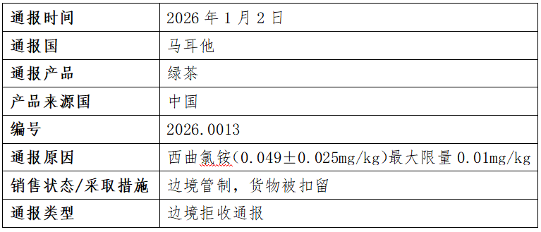 2026年1月2日,欧盟委员会通报了1例我国出口绿茶的不合格案例,主要原因是西曲氯铵含量(0.049±0.025mg/kg)超过最大限量0.01mg/kg。