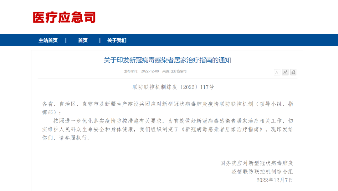 12月8日,国务院联防联控机制发布《新冠病毒感染者居家治疗指南》,强调要按照进一步优化落实疫情防控措施有关要求,有效做好新冠病毒感染者居家治疗相关工作。