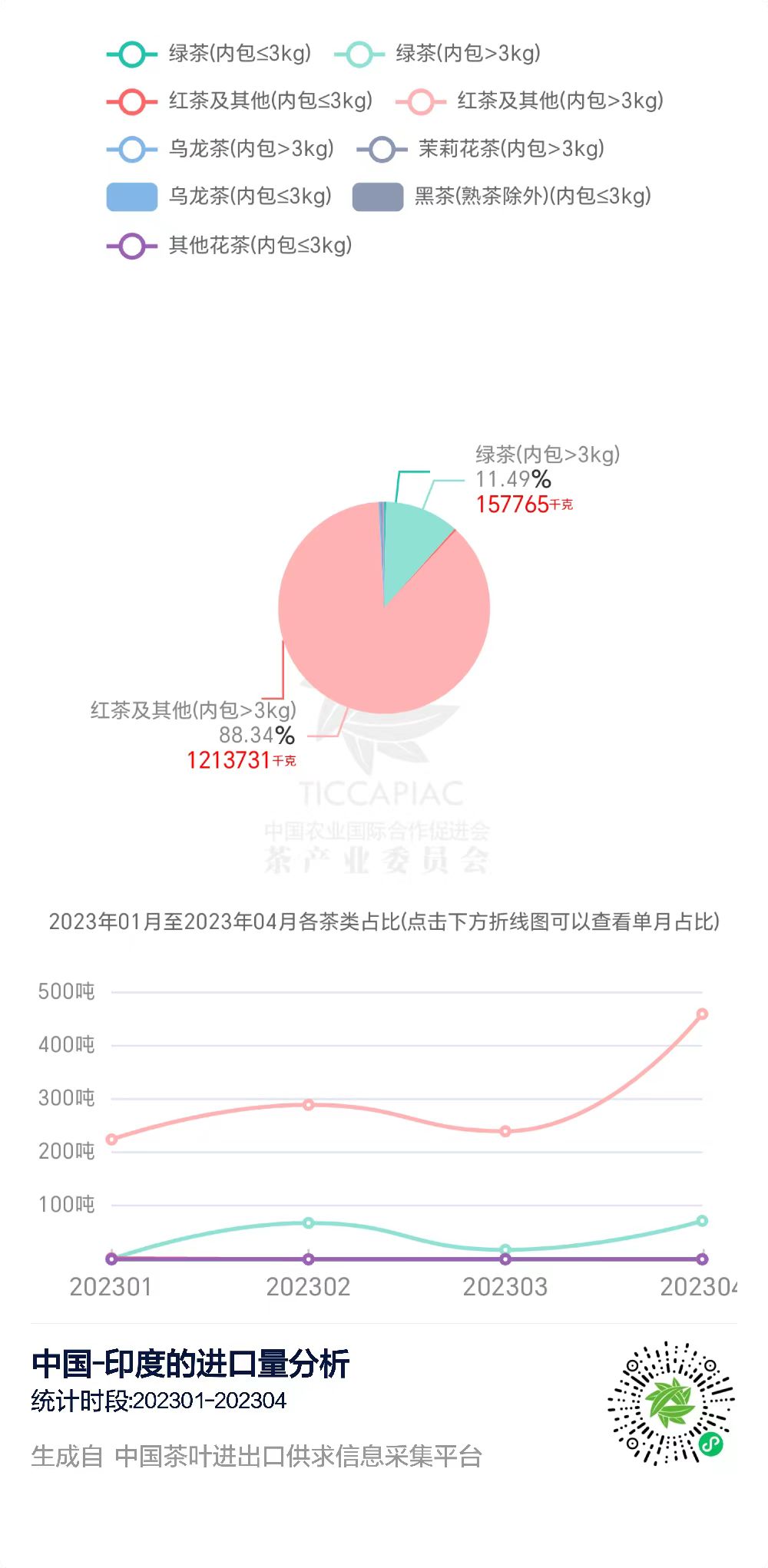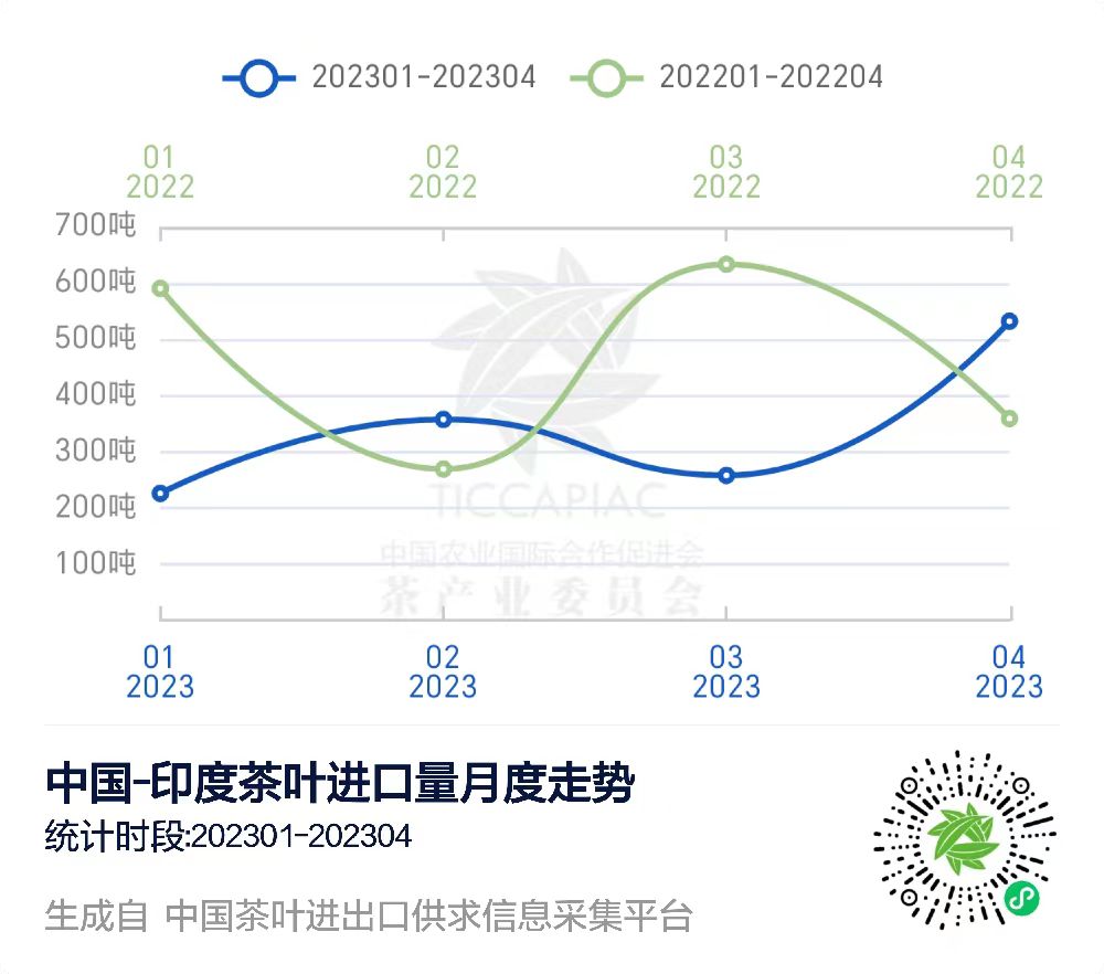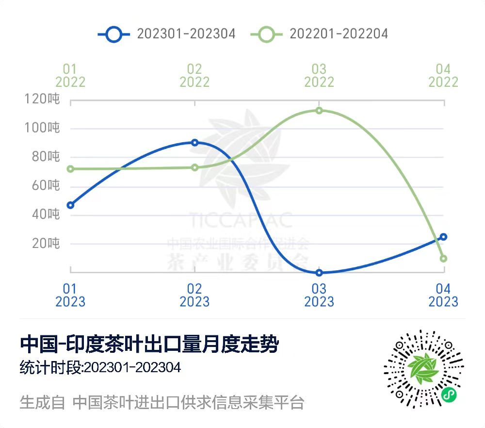 在“中国茶叶进出口供求信息采集平台”上,我们可以查询到2023年1-4月中国与印度的茶叶进出口贸易数据。