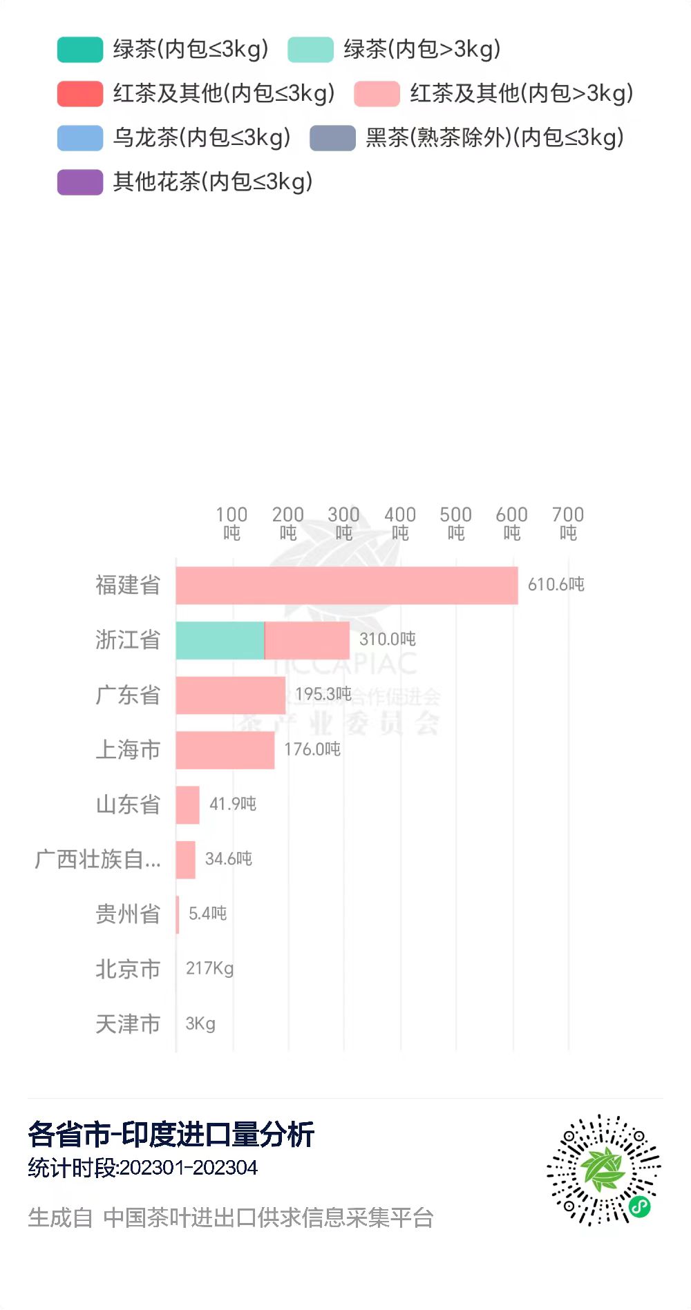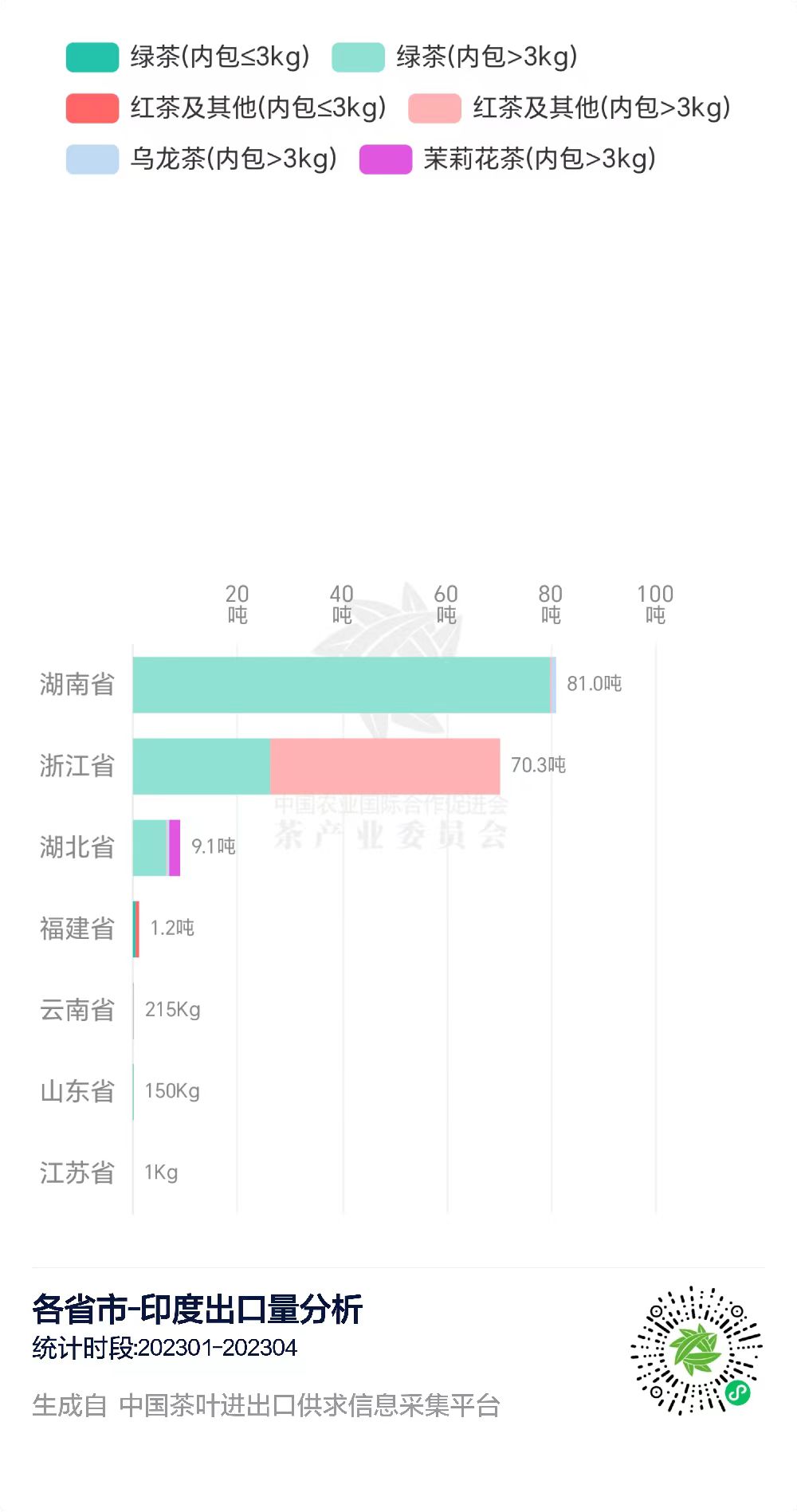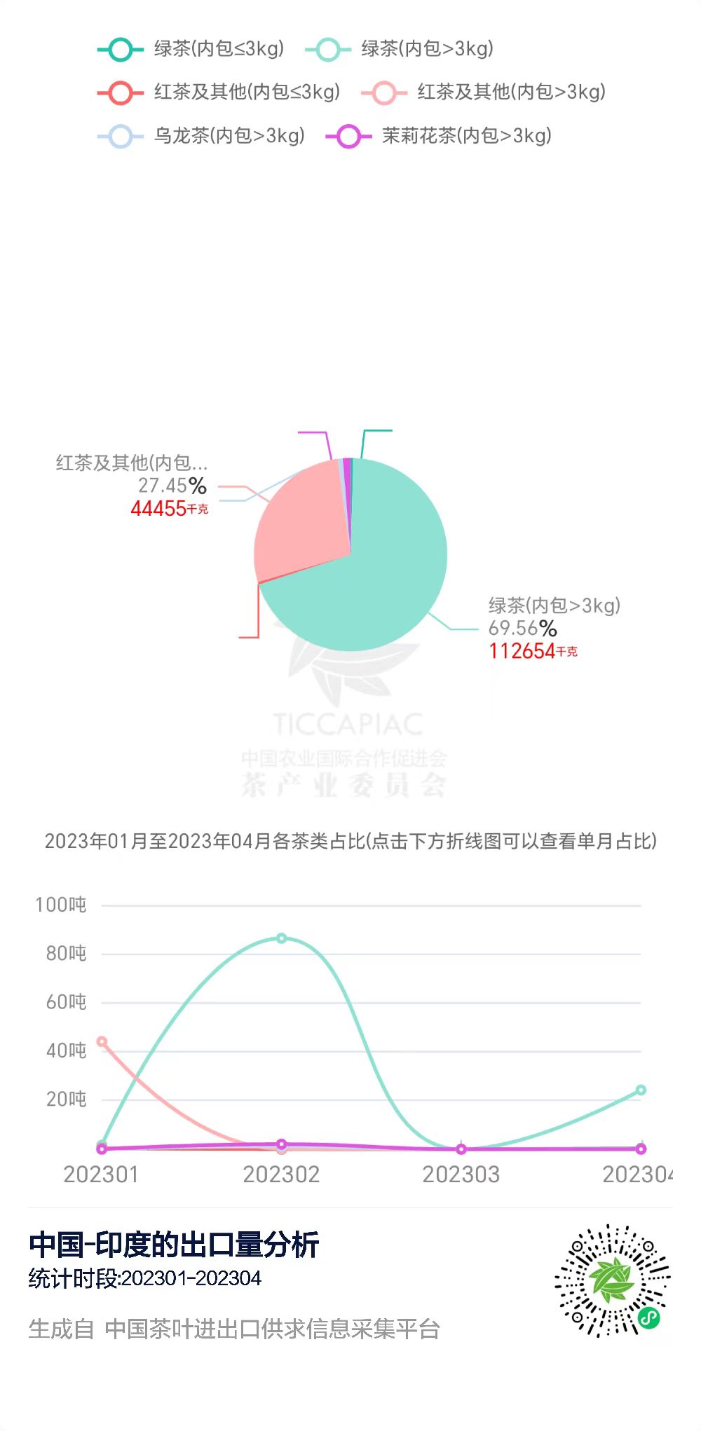 在“中国茶叶进出口供求信息采集平台”上,我们可以查询到2023年1-4月中国与印度的茶叶进出口贸易数据。