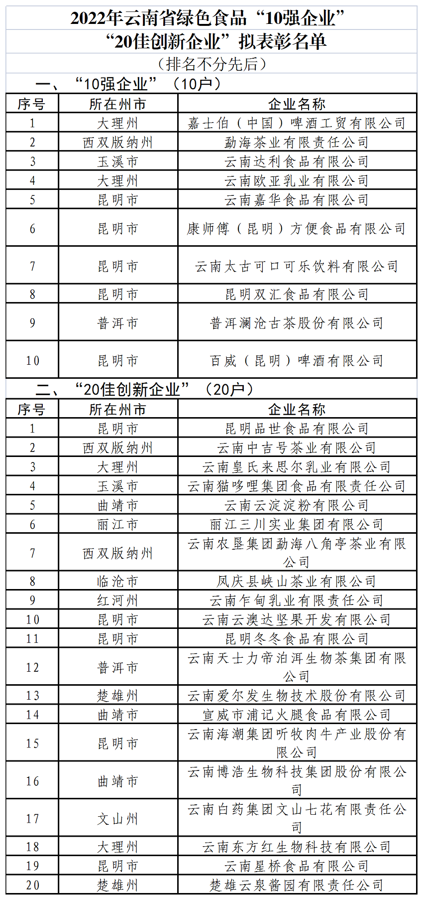 8月30日,云南省农业农村厅、云南省工业和信息化厅、云南省人力资源和社会保障厅成立了云南省“10大名品”和绿色食品“10强企业”“20佳创新企业”评选表彰工作领导小组,全面组织开展了申报评选工作。经主体自愿申报、县区审核和公示、州市推荐、初审和州(市)公示、第三方评选服务机构组织专家评审、向省直相关部门征求意见并经省级复审后,提出2022年云南省“10大名品”拟表彰对象50个、绿色食品“10强企业”“20佳创新企业”拟表彰对象30个,现予以公示。公示期自2022年8月31日-9月6日(共7天)。