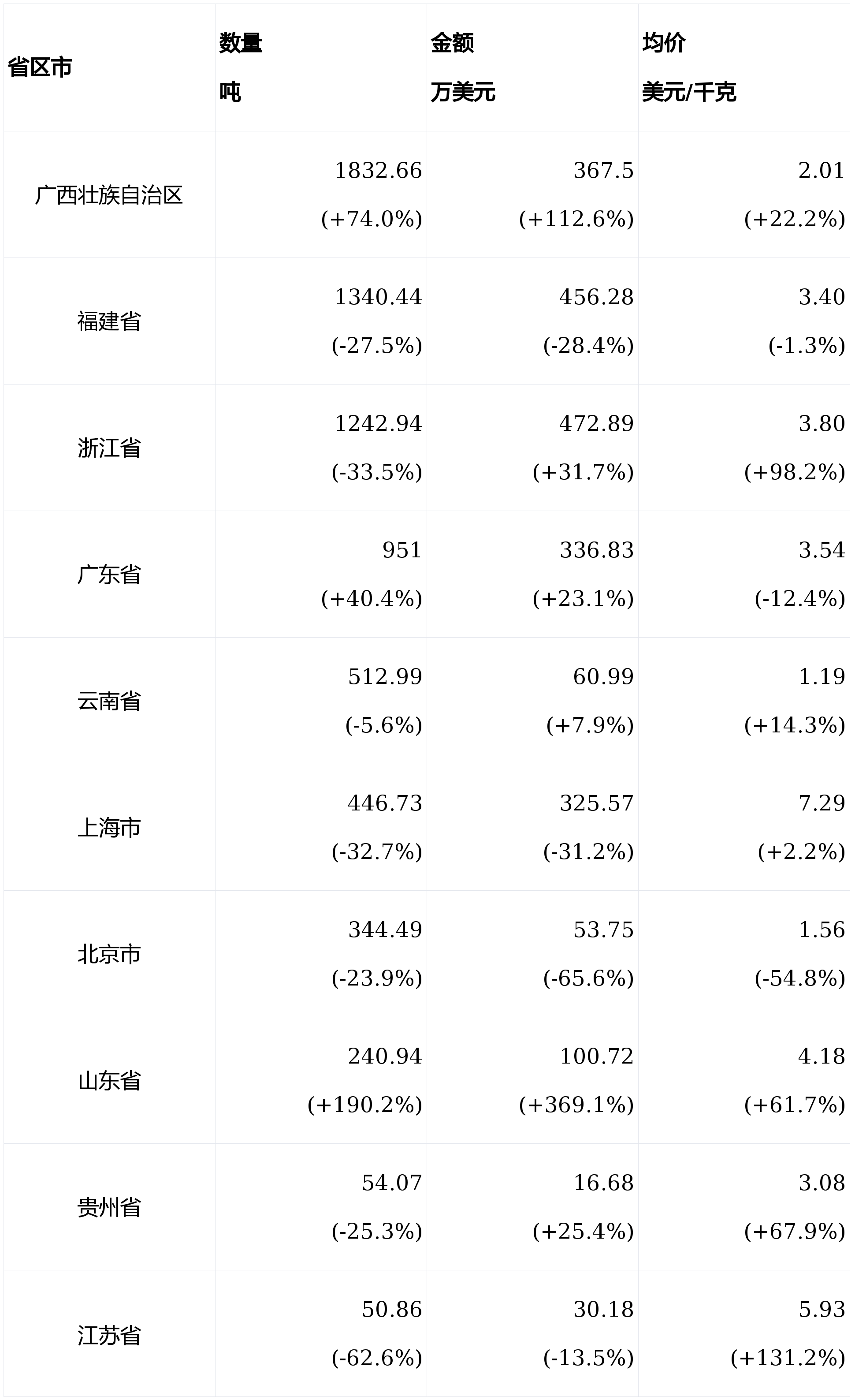 茶叶进口省区市位居前10位的分别是广西壮族自治区、福建省、浙江省、广东省、云南省、上海市、北京市、山东省、贵州省、江苏省。山东省进口量(240.94吨)、金额(100.72万美元)同比增幅最大,分别达190.2%和369.1%;江苏省进口量(50.86吨)和进口额(30.18万美元)同比降幅最大,分别达62.6%和13.5%。