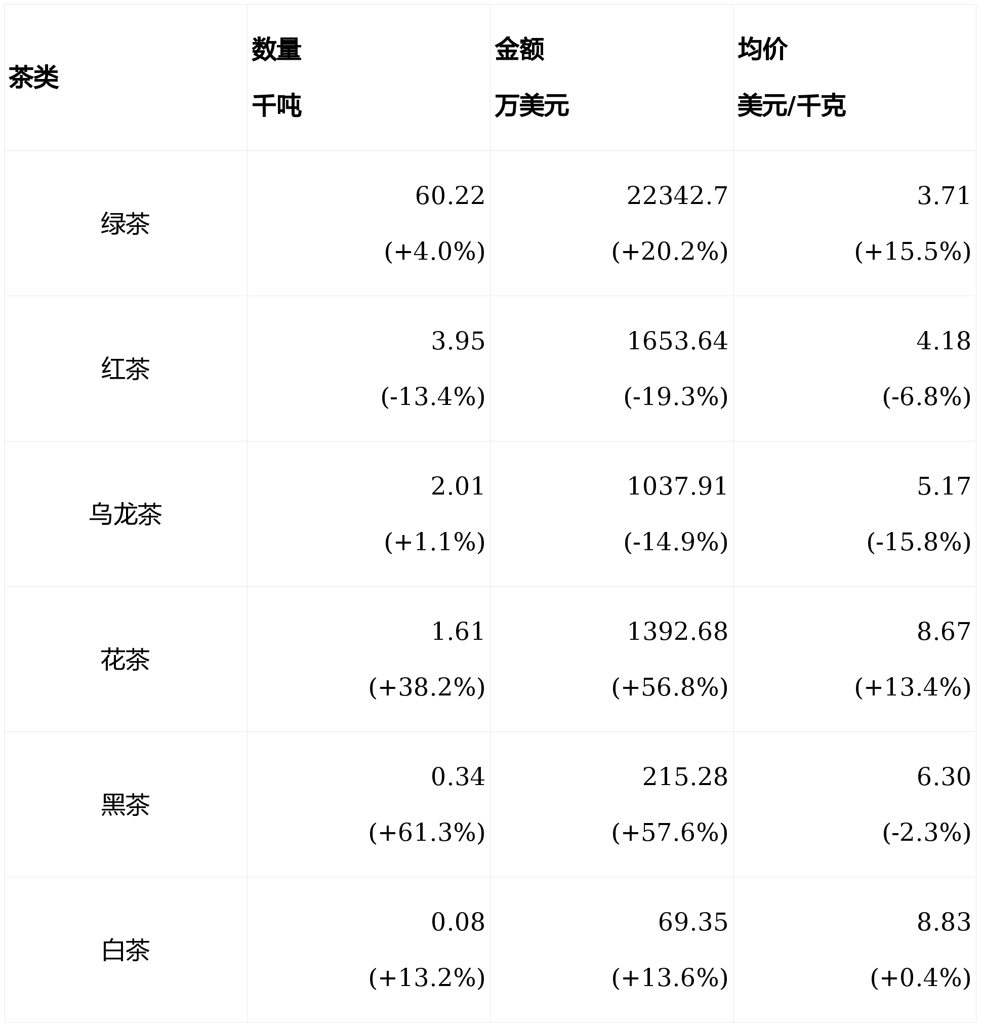 各茶类中绿茶(60.22千吨)、乌龙茶(2.01千吨)、花茶(1.61千吨)、黑茶(0.34千吨)、白茶(0.08千吨)出口量呈同比增长态势,黑茶增幅最大约61.3%。红茶(3.95千吨)出口量呈同比下降趋势,红茶出口量同比降幅最大达13.4%。