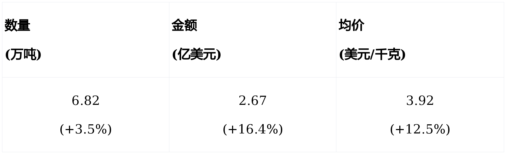 据中国海关数据,2026年1-2月,中国内地茶叶出口量6.82万吨,出口额约2.67亿美元,同比分别增长3.5%和增长16.4%,均价3.92 美元/千克,同比上涨12.5%。