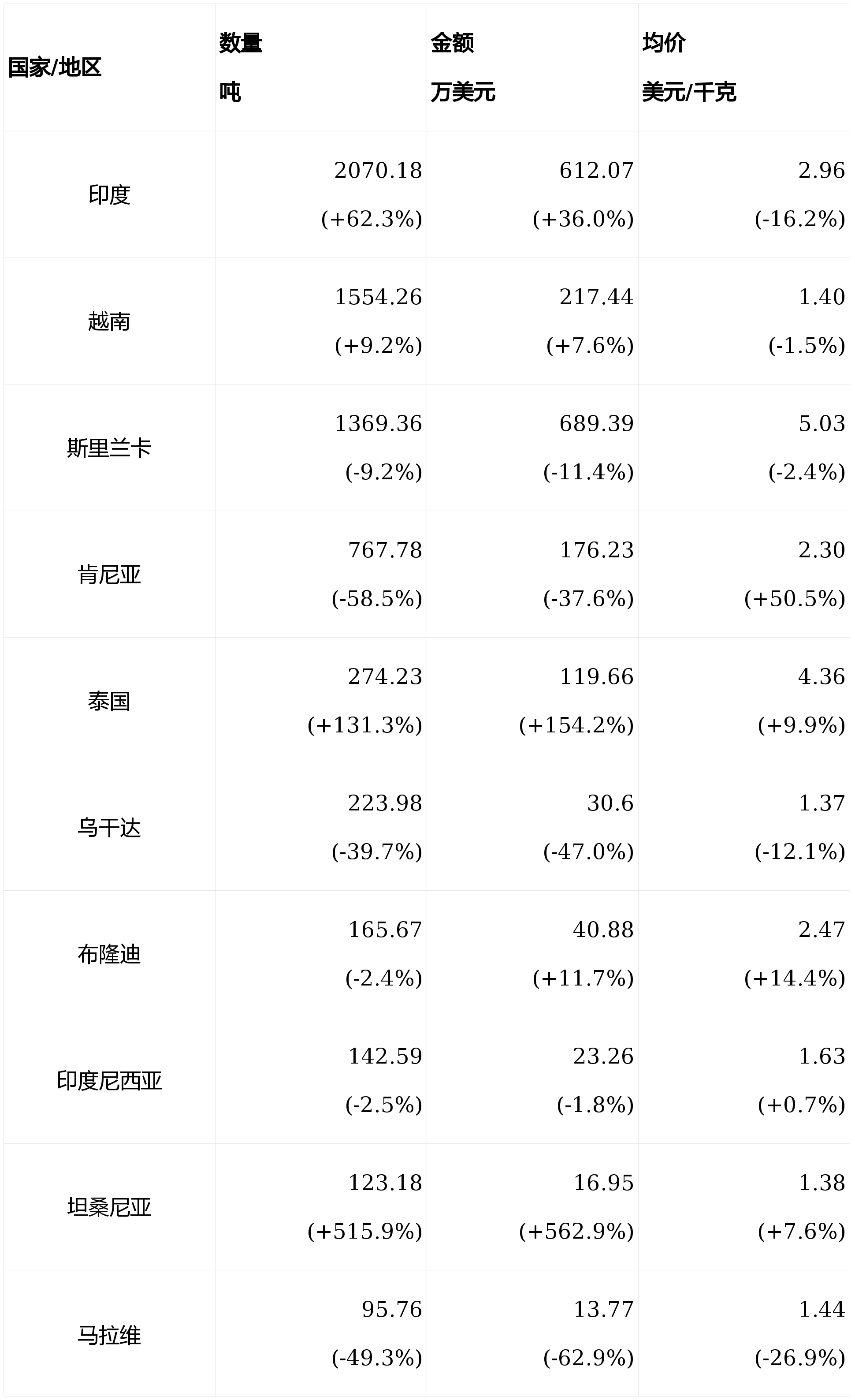 茶叶进口市场位居前10位的分别是印度、越南、斯里兰卡、肯尼亚、泰国、乌干达、布隆迪、印度尼西亚、坦桑尼亚、马拉维。从坦桑尼亚进口量(123.18吨)、金额(16.95万美元)同比增幅最大,分别达515.9%和562.9%;从肯尼亚进口量(767.78吨)和进口额(176.23万美元)同比降幅最大,分别达58.5%和37.6%。