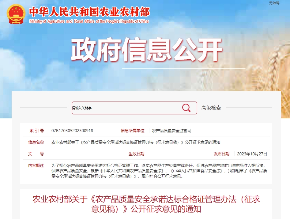 为了规范农产品质量安全承诺达标合格证管理工作,落实农产品生产经营主体责任,促进农产品产地准出与市场准入相衔接,保障农产品质量安全,根据《中华人民共和国农产品质量安全法》、《中华人民共和国食品安全法》,农业农村部起草了《农产品质量安全承诺达标合格证管理办法(征求意见稿)》,现向社会公开征求意见。公众可通过以下途径和方式提出反馈意见: