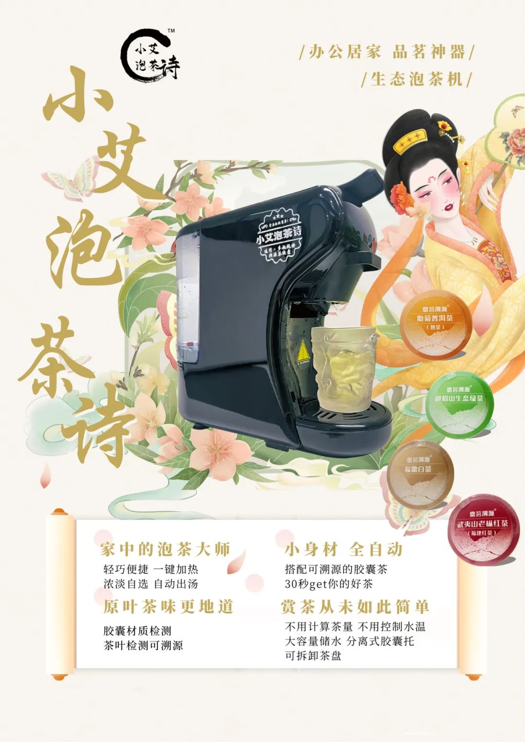“小艾泡茶诗胶囊茶组合”定位“泡茶标准化”,为消费者提供如咖啡机般便捷的冲泡体验,仅需两步,像泡咖啡一样泡茶,茶香四溢,事半功倍!