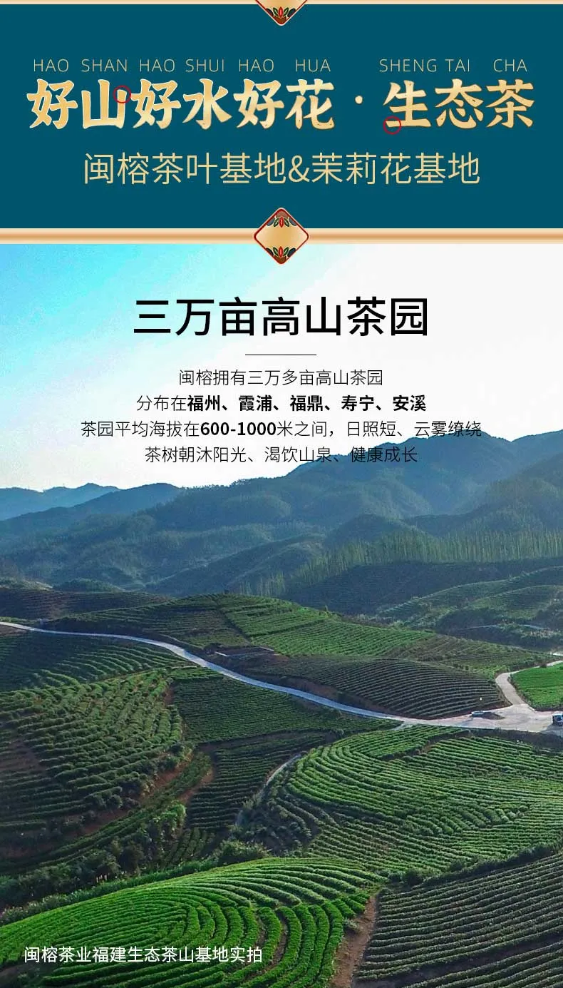 伏天采摘的福州茉莉花搭配珍贵的福建高山春茶,在每年清明前之前严格按照“一芽一叶初展”的标准,采摘于闽榕自有的高山生态茶园。闽榕在名茶大省福建的福州、霞浦、福鼎、寿宁、安溪、三明拥有六大种植基地,共计3万多亩,茶园平均海拔在600-1000米之间,光照充足,山间云雾缭绕,山泉灌溉,是天然的产茶圣地。