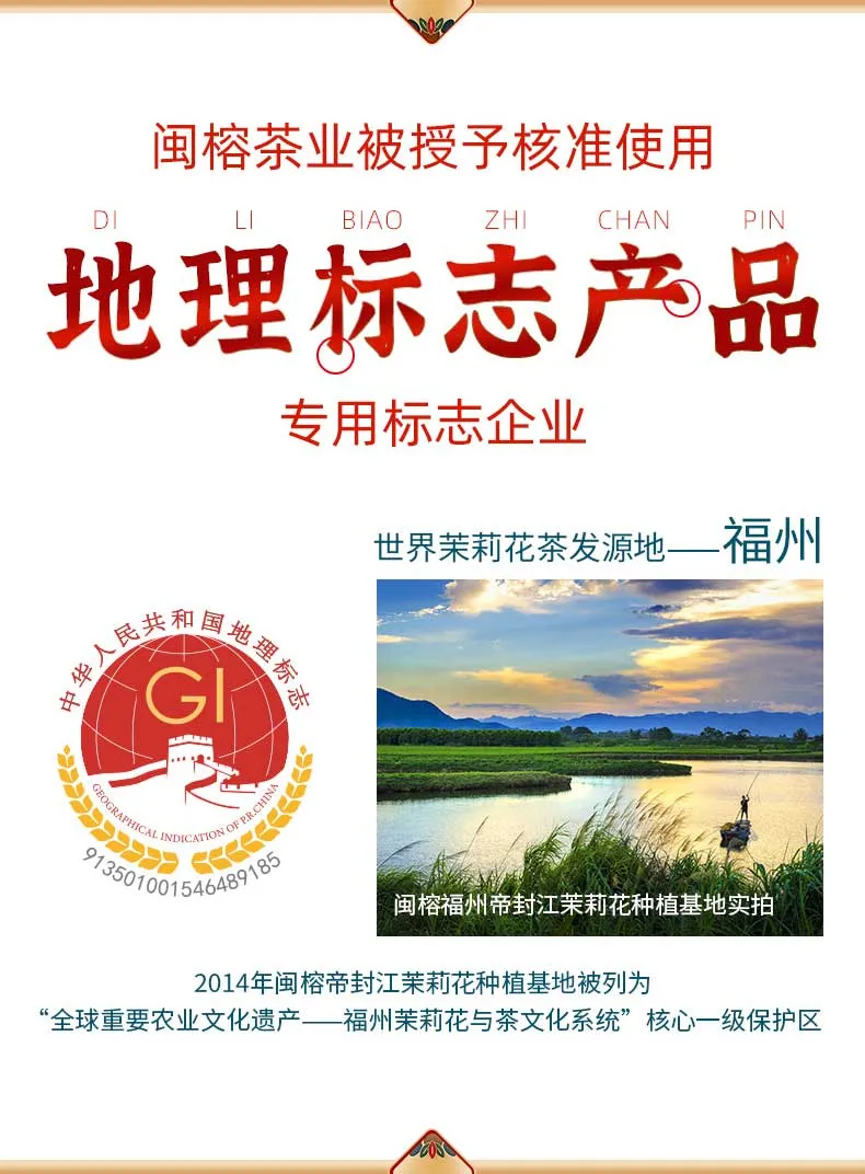 福州茉莉花茶是国家地理标志保护产品,2020年9月中欧正式签署《中欧地理标志协定》后,福州茉莉花茶更是荣膺成为《中欧地理标志协定》协定中首批中国100个地理标志产品之一。