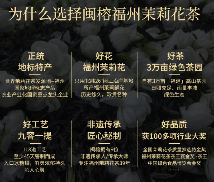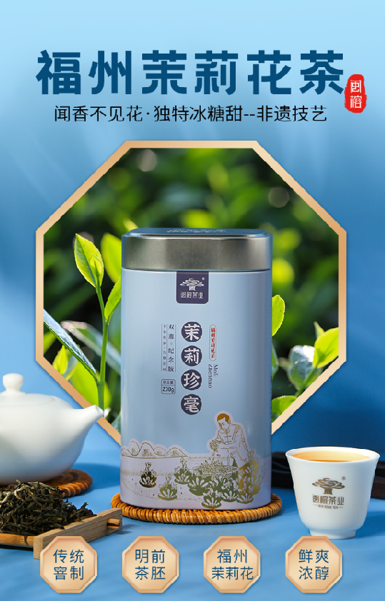 千米之上的高山绿茶与福州伏天茉莉鲜花完美邂逅,闽榕三十九年的福州茉莉花茶匠心品牌与九位工艺传承大师的精心研发,只为造就一款满足普罗大众都喝得起的日常口粮茶。