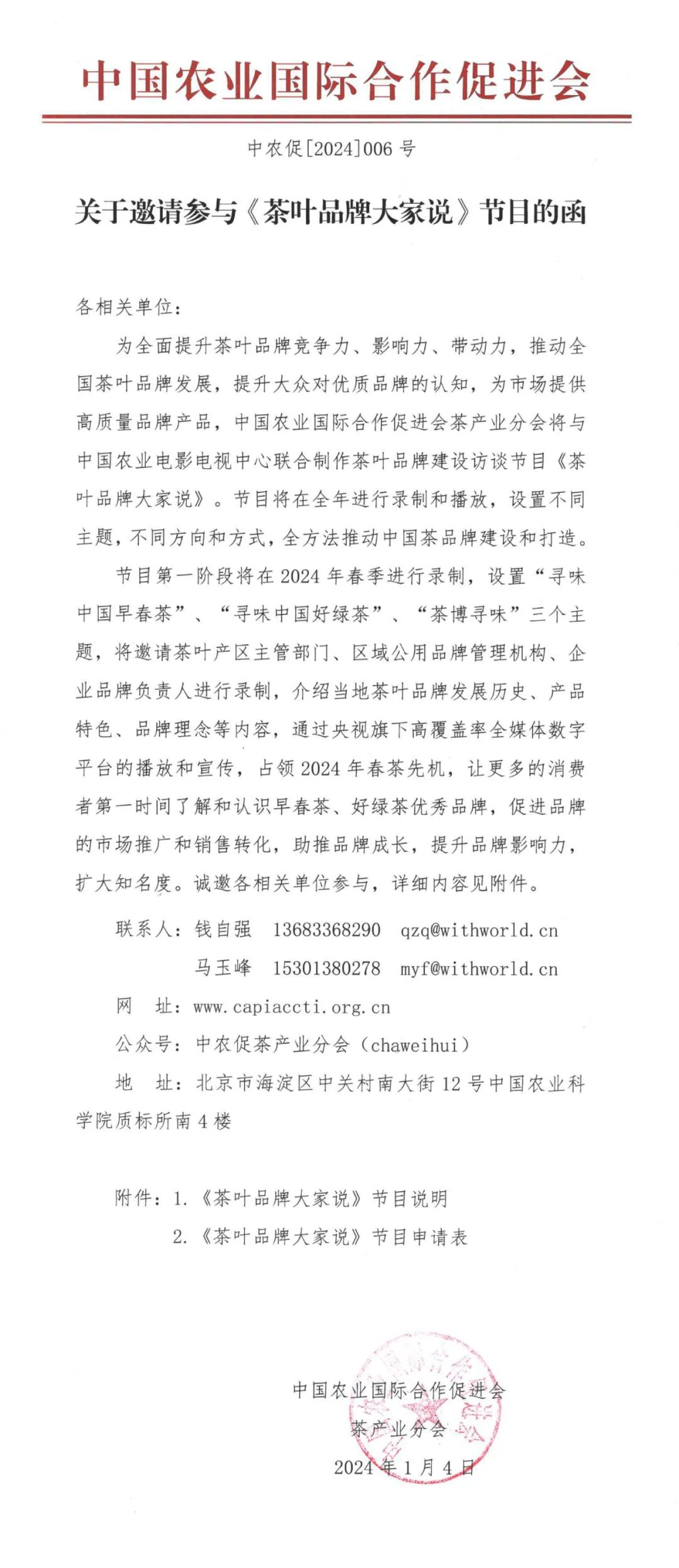 为全面提升茶叶品牌竞争力、影响力、带动力,推动全国茶叶品牌发展,提升大众对优质品牌的认知,为市场提供高质量品牌产品,中国农业国际合作促进会茶产业分会将与中国农业电影电视中心联合制作茶叶品牌建设访谈节目《茶叶品牌大家说》。节目将在全年进行录制播放,设置不同主题、方向和方式,全方位推送中国茶品牌建设和打造。