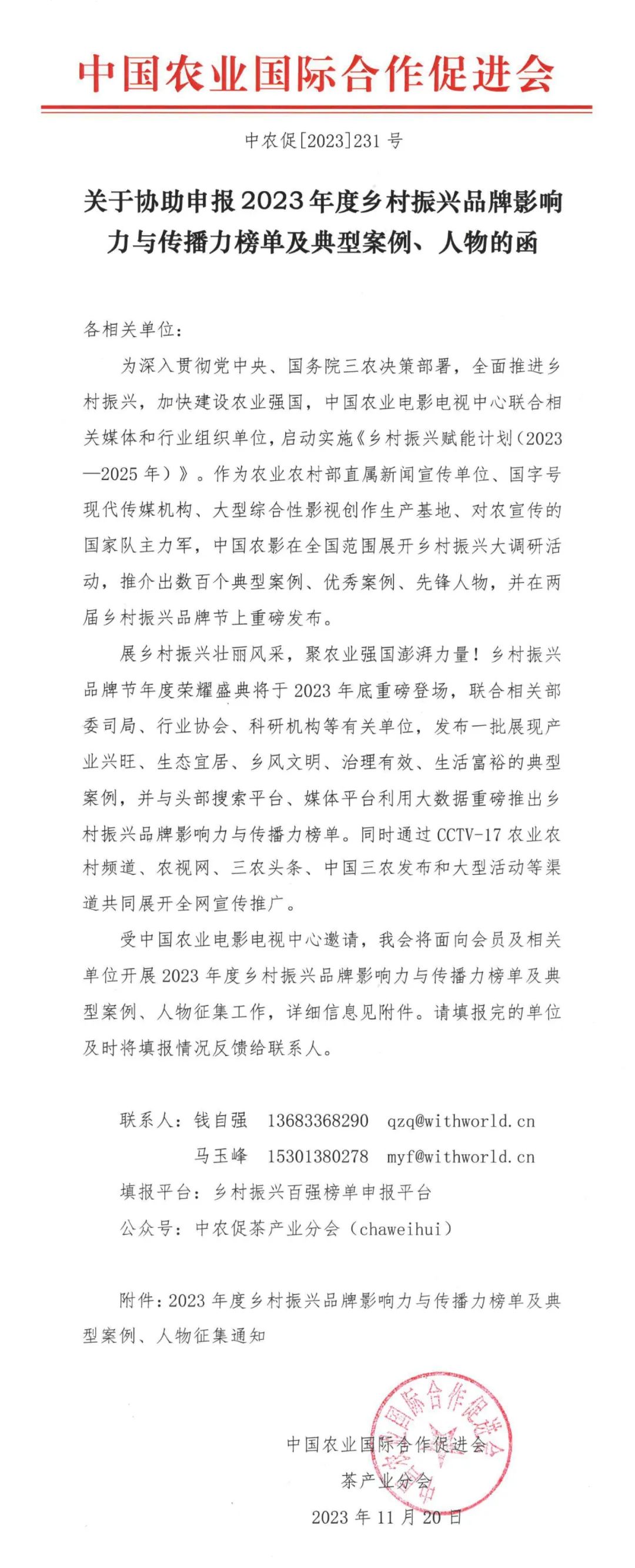 受中国农业电影电视中心邀请,我会将面向会员及相关单位开展2023年度乡村振兴品牌影响力与传播力榜单及典型案例、人物征集工作,详细信息见附件。请填报完的单位及时将填报情况反馈给联系人。