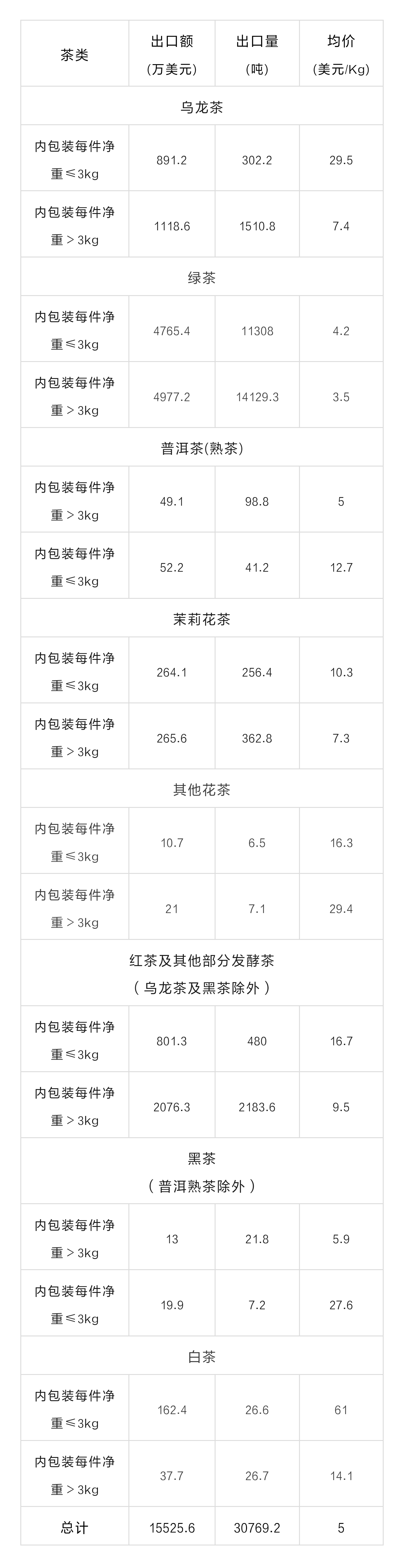2023年8月中国茶叶分茶类出口数据