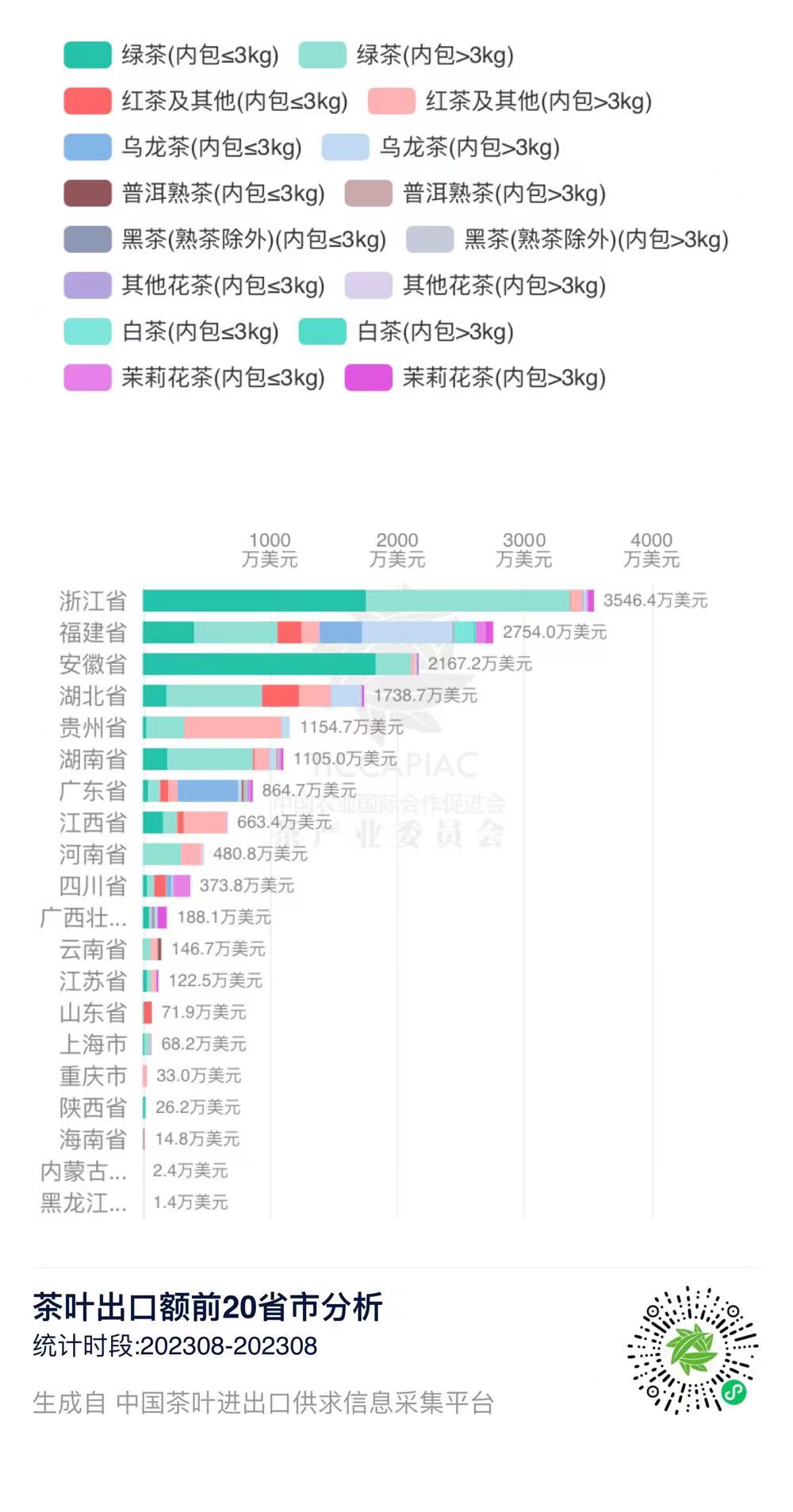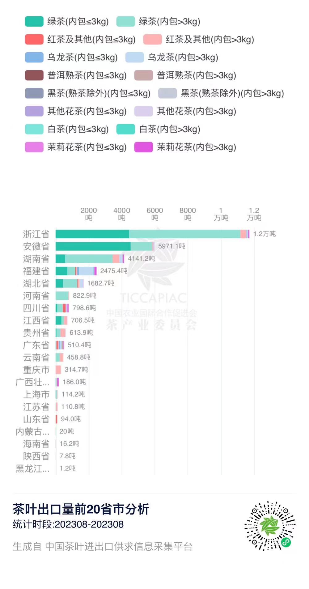 2023年8月中国茶叶出口量前20省市