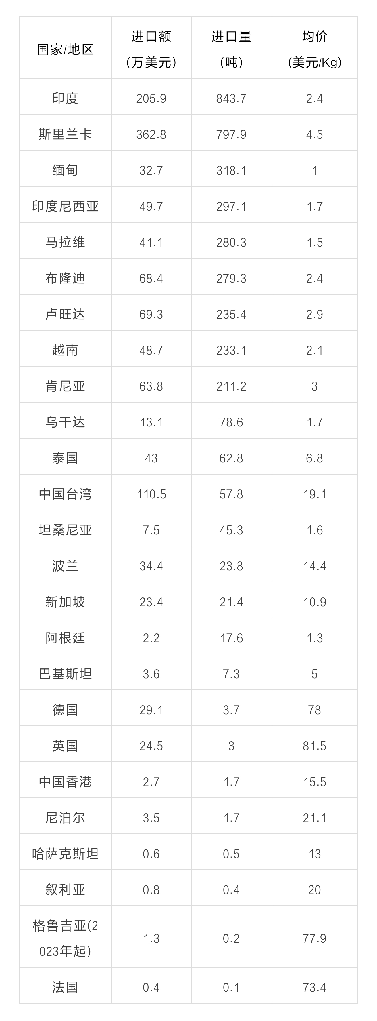 2023年8月中国茶叶主要进口国家/地区