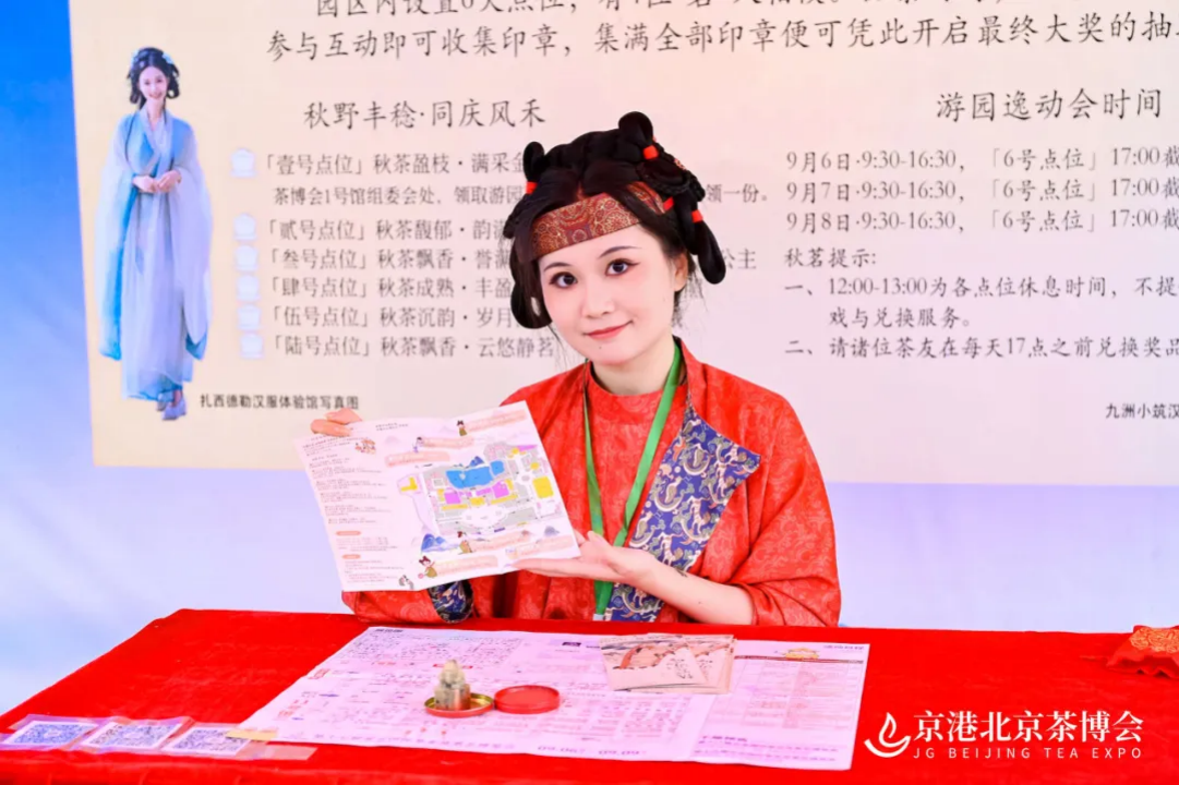 在室外展园,“与子同袍·茗动天下”秋茗雅趣游园逸动会精彩上演。各个打卡点观众参与投壶、问答等趣味活动络绎不绝,观众们集章“通关”,携“通关文牒”参与抽奖,诸多精美奖品被幸运观众带走。