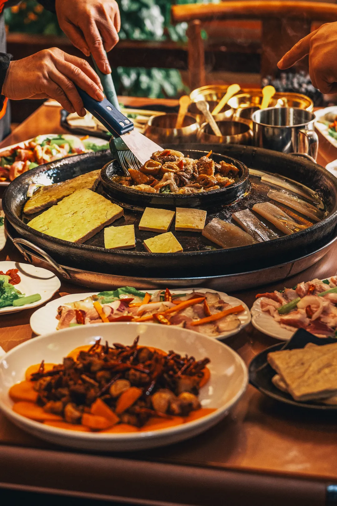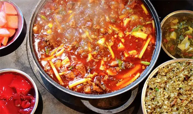 凝聚深深乡情的烙锅。一锅美食在火上慢慢烙制,各种食材在平底锅里交织出美妙的味道,蘸上精心调配的蘸水,再来一口汽水,过瘾!