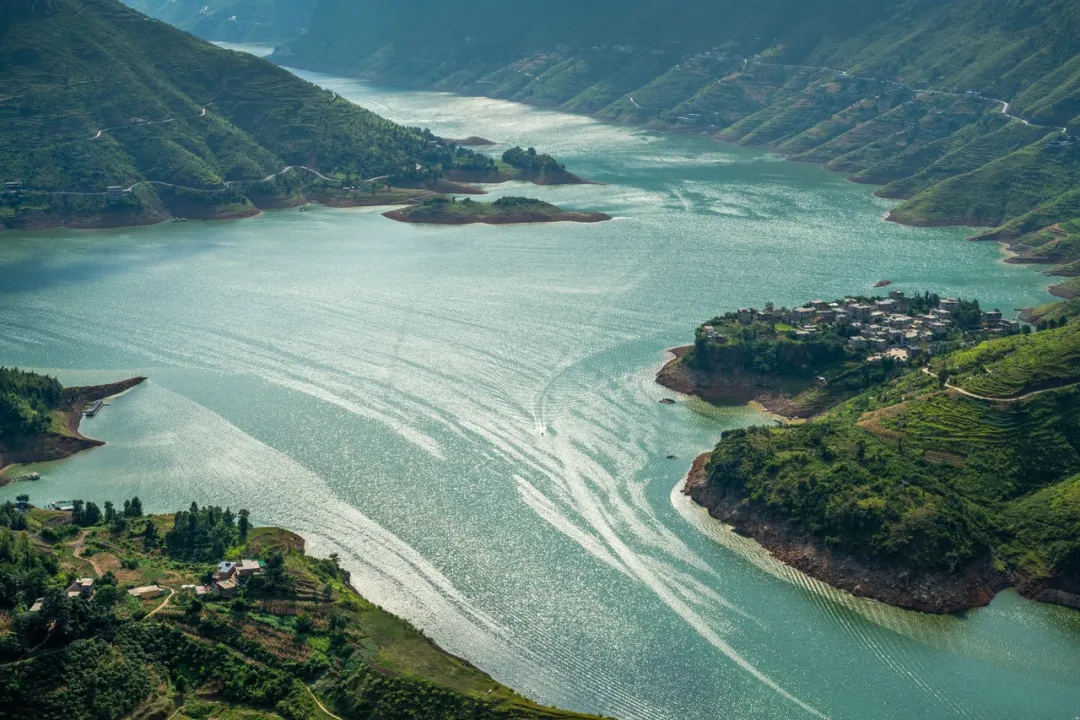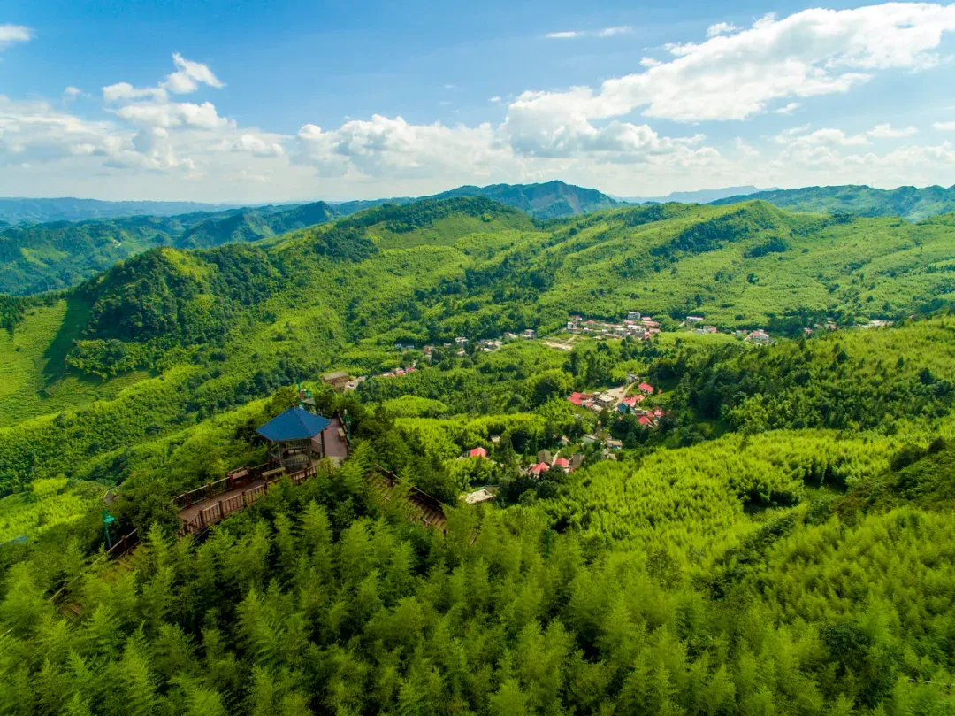 这片绿意中,零星散落的房屋点缀其间,远远望去,宛如一条精美的珠链,环绕在山间。