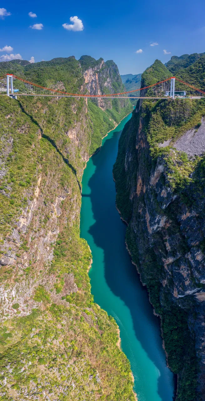 抬头望去,一湾清澈的江水宛如蓝宝石般熠熠生辉,在峡谷中缓缓流淌,而那斧削般的绝壁则宛如一幅波澜壮阔的巨幅长廊壁画,诗意盎然,让人陶醉其中。